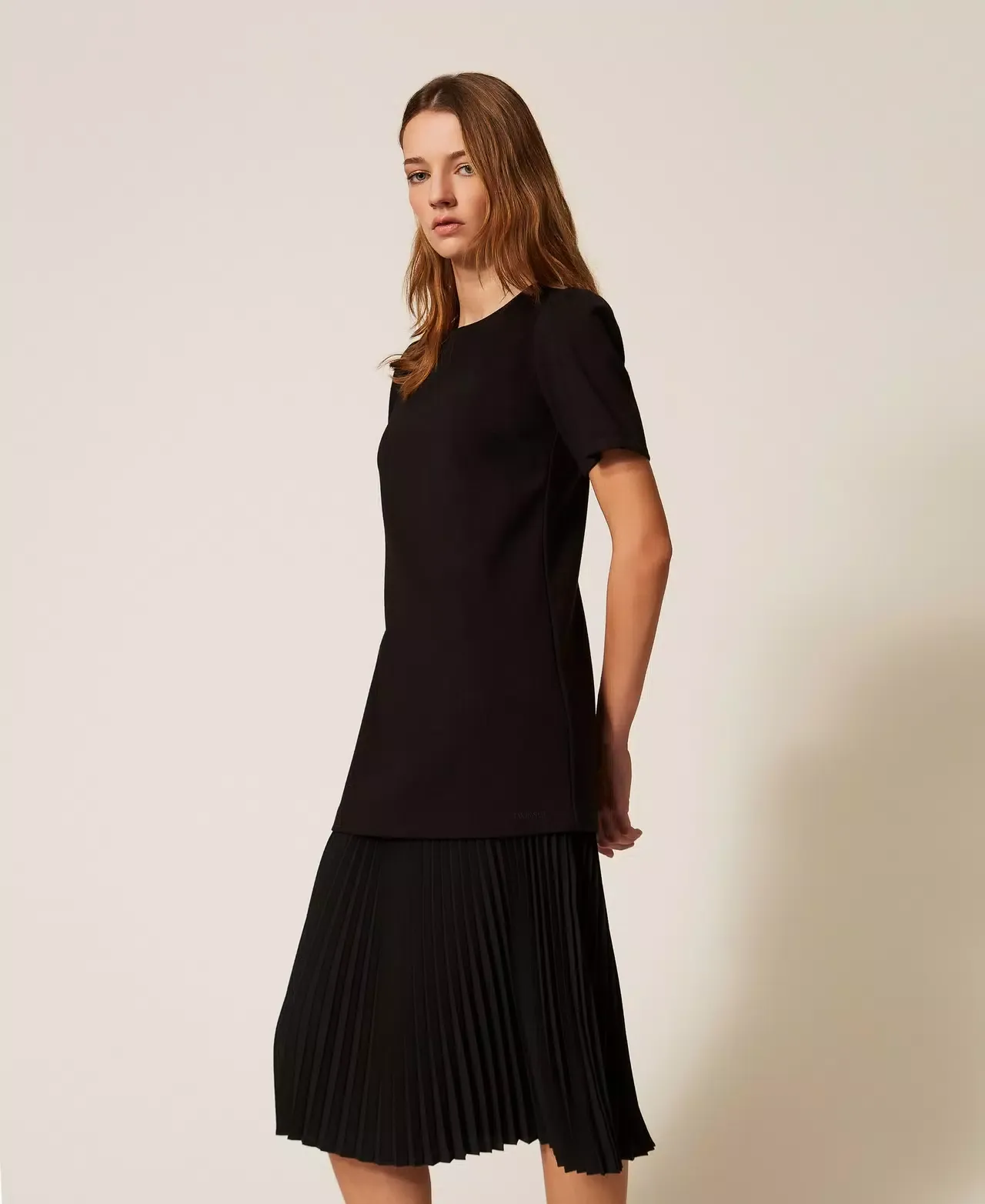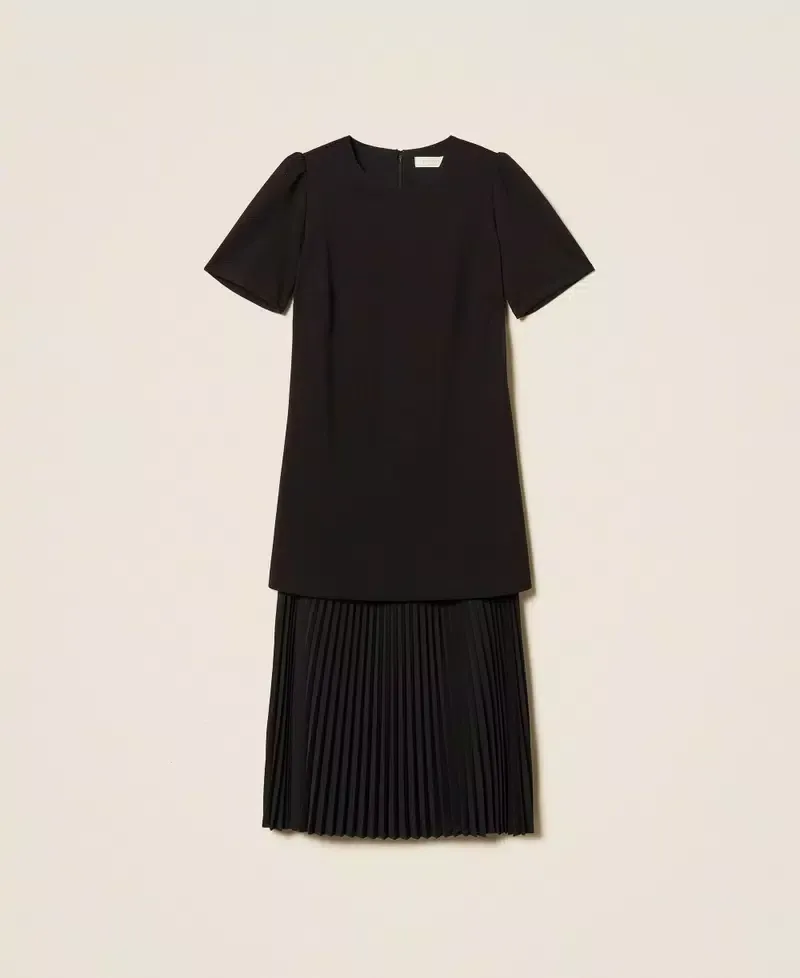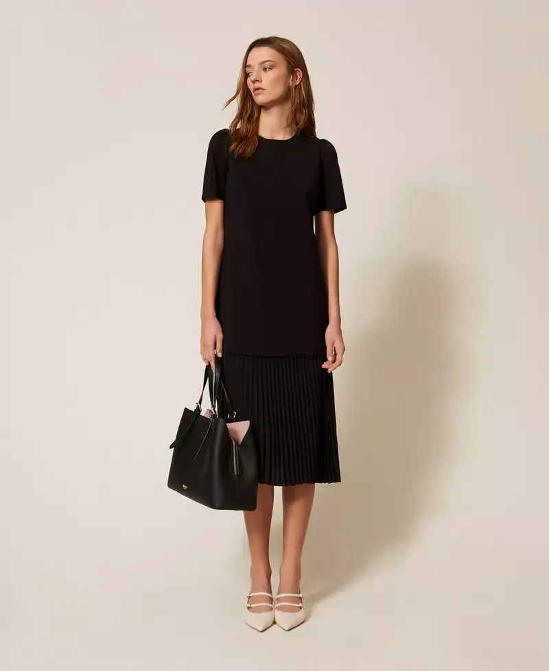 LENZING™ ECOVERO™ stretch viscose Milano stitch midi dress with pleated crepe de Chine (100% certified post-consumer recycled polyester) insert. Round neck, short sleeves, zip fastening on the back, straight fit. Any micro-impurities are typical of recycled materials. This item is part of the “Archive” range, inspired by the most iconic and most loved garments from the Twinset collections.