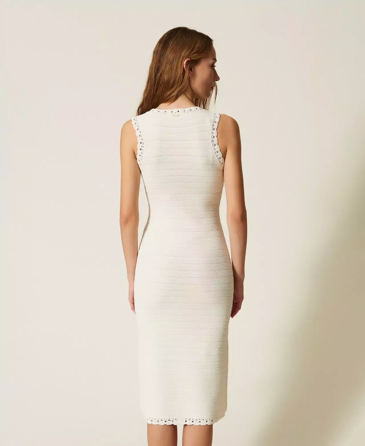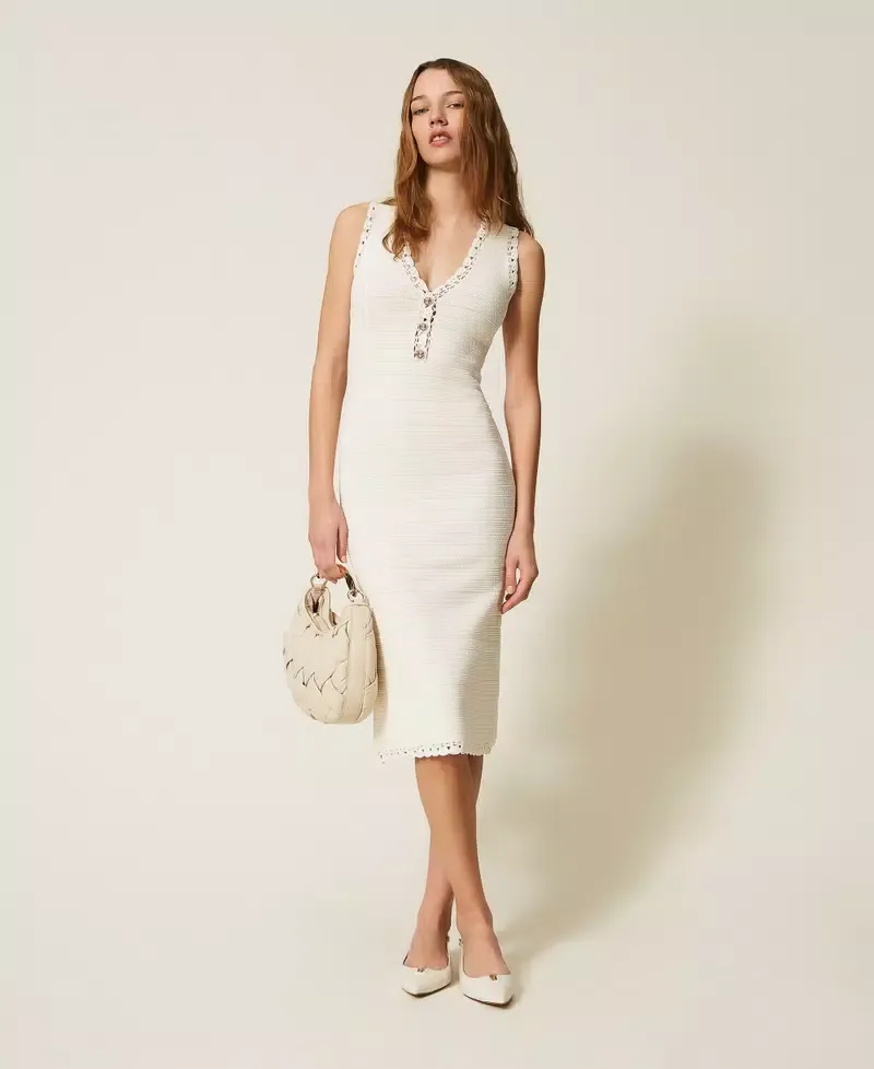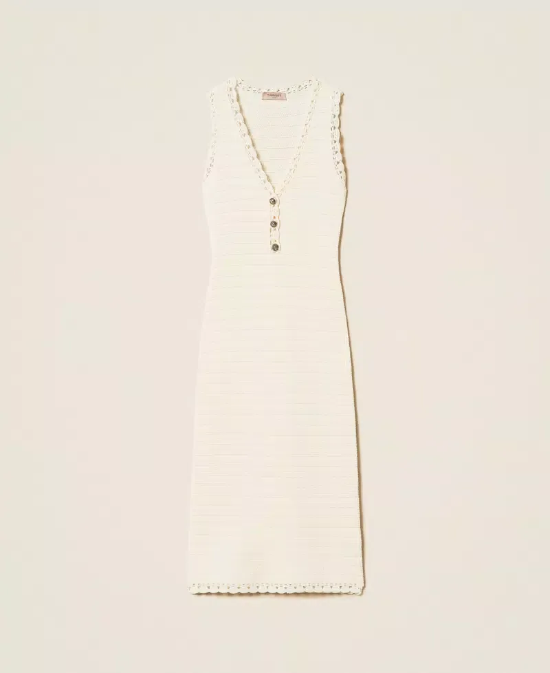 Long viscose blend knit dress with compact stitch work that creates horizontal stripes and crochet trims. V neck, front opening with gold-tone buttons, fitted.