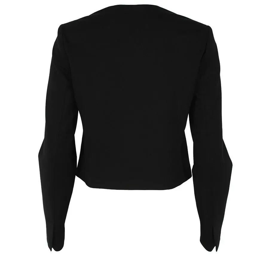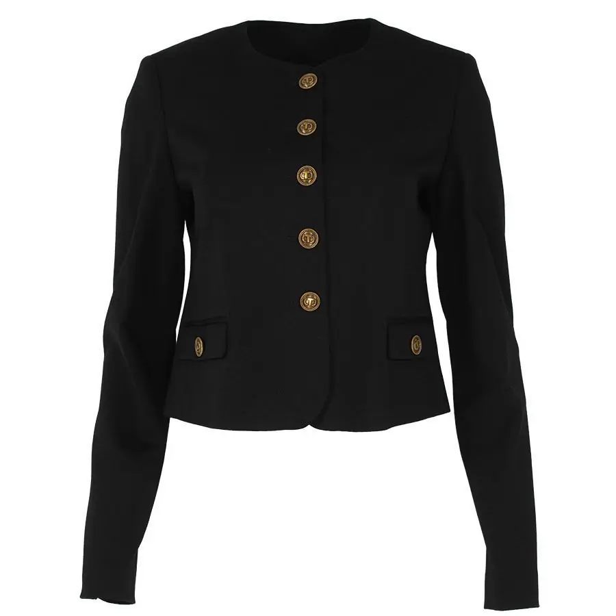 Long-sleeved blazer, collarless, with a single row of buttons and decorative patch with buttons.