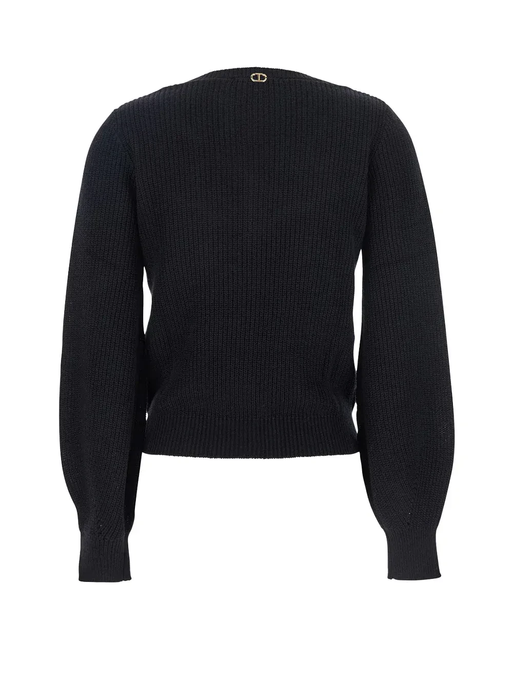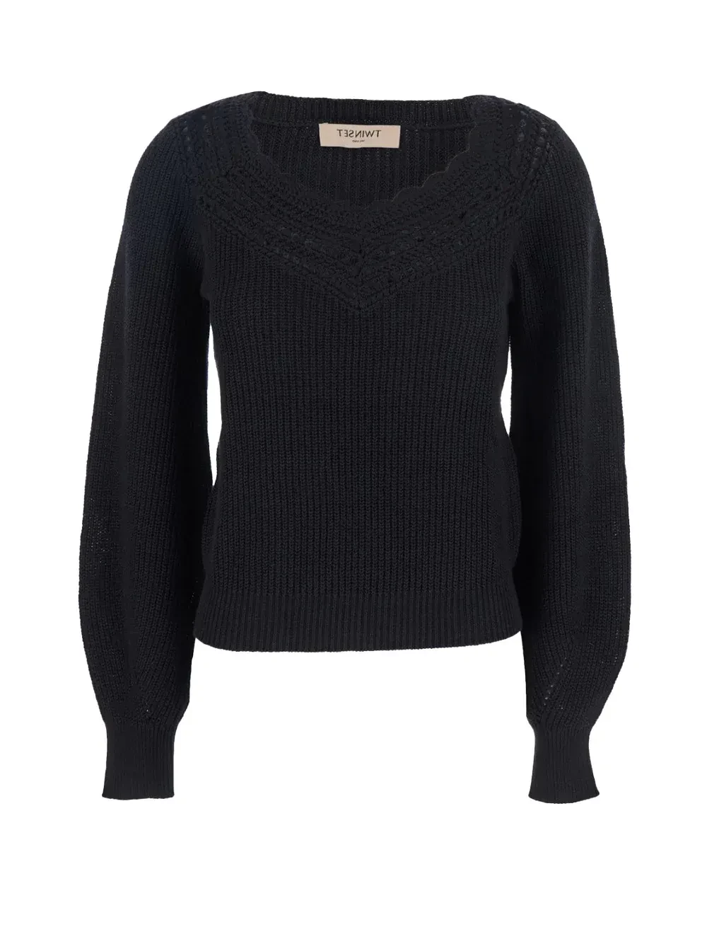 Cotton and wool cob stitch jumper with hand scalloped crochet insert at the yoke. Wide neckline, long wide and slightly puffed sleeves, Oval T logo plate on the back, loose fitting.