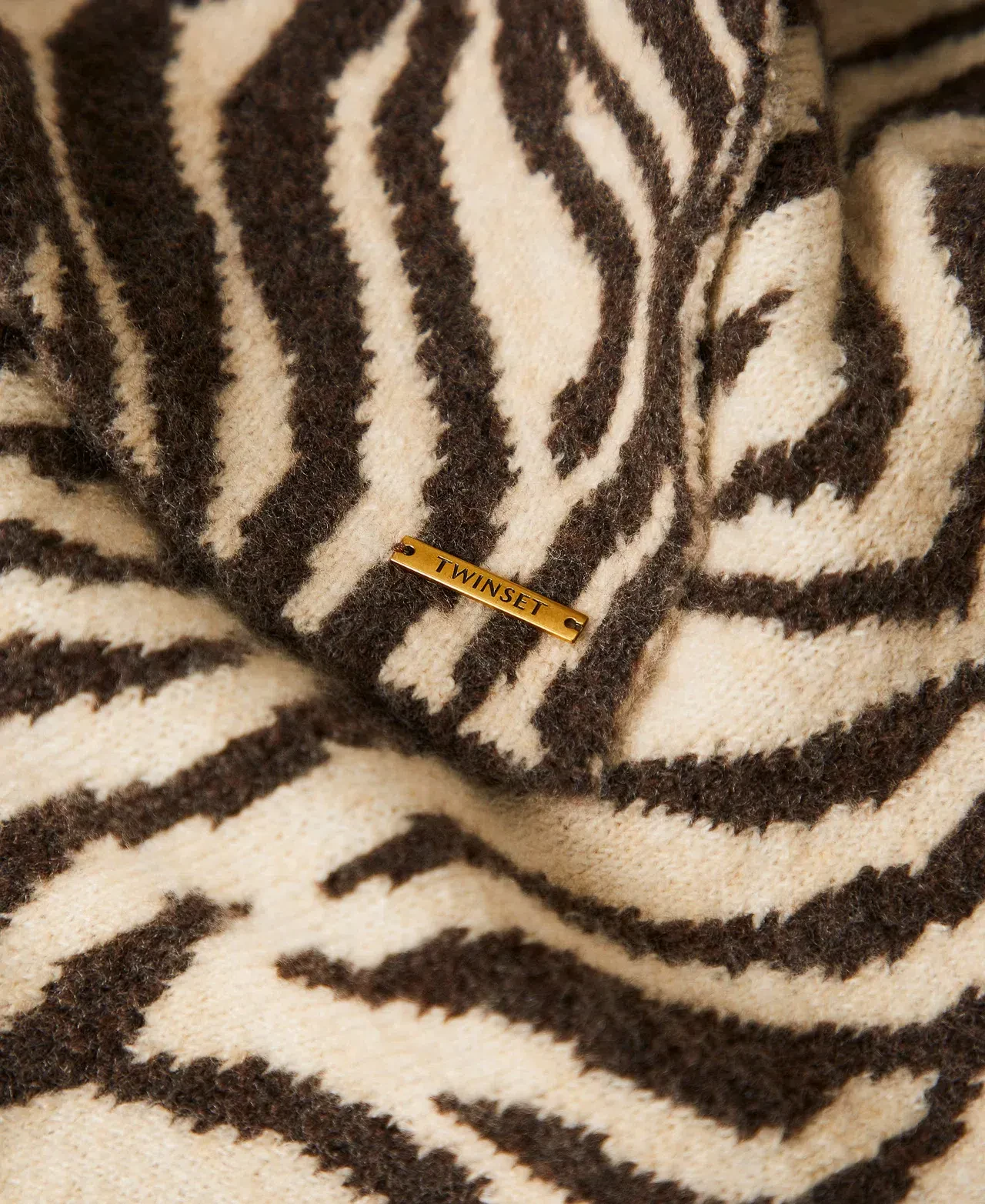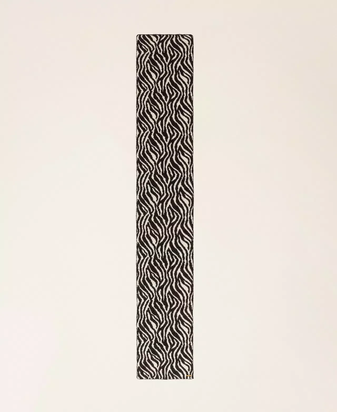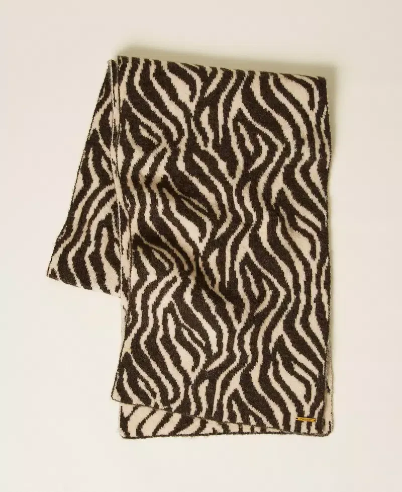 Animal print jacquard knit scarf with metal logo plate.