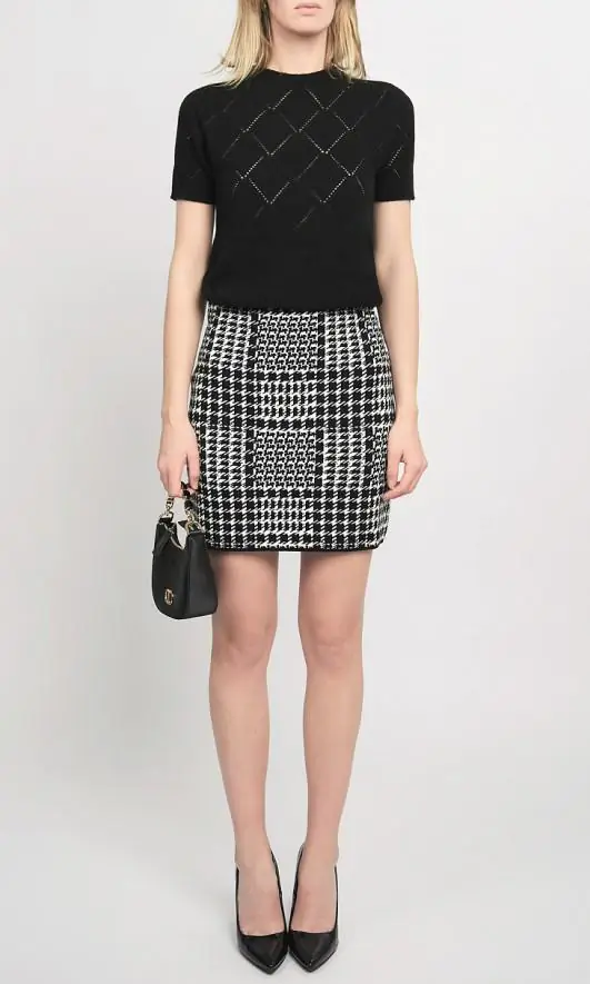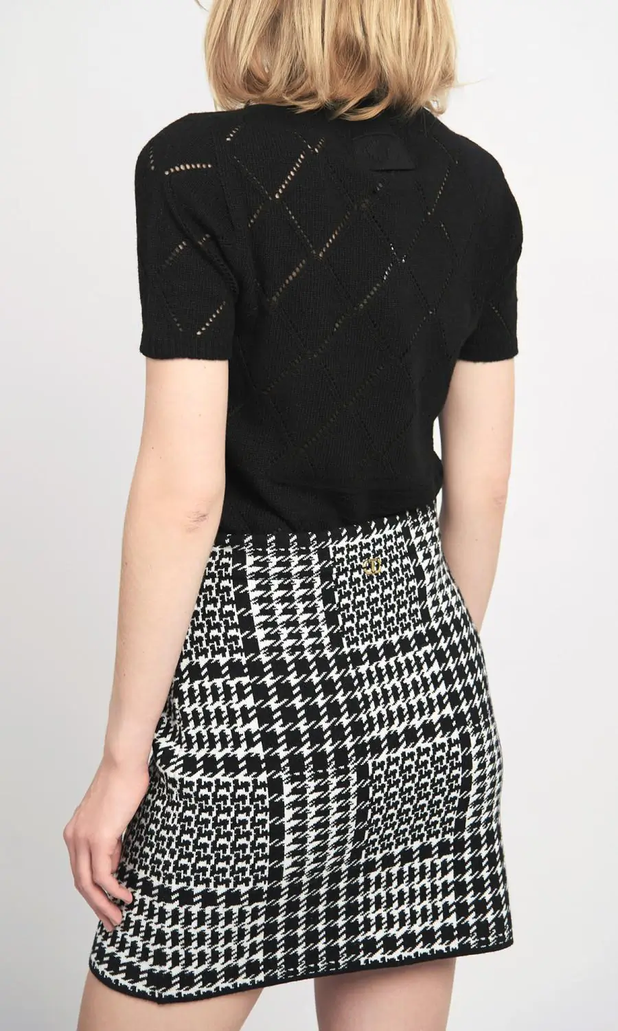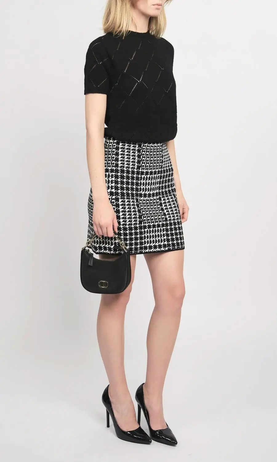TWINSET skirt in technical knit with a checkered pattern in contrasting colors. It features a straight cut, mini length.