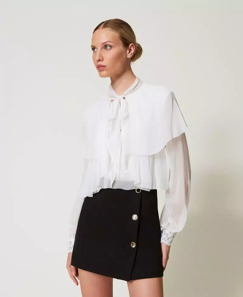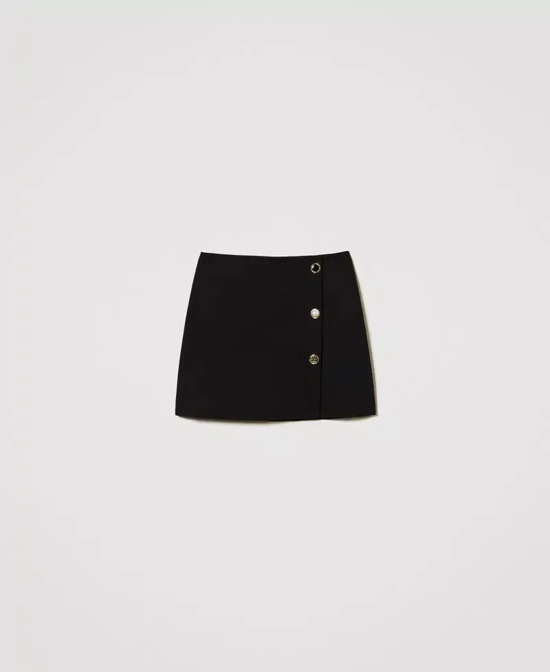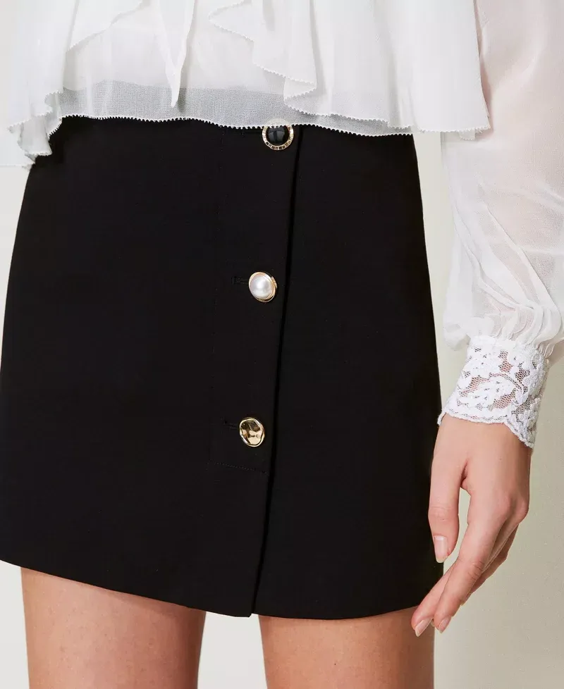 Viscose blend jersey miniskirt with Milano stitch construction, trompe l’oeil side slit with jewel buttons with different details. Regular waist, side zip fastening, Oval T logo plate on the back, lining, straight and slightly flared fit.