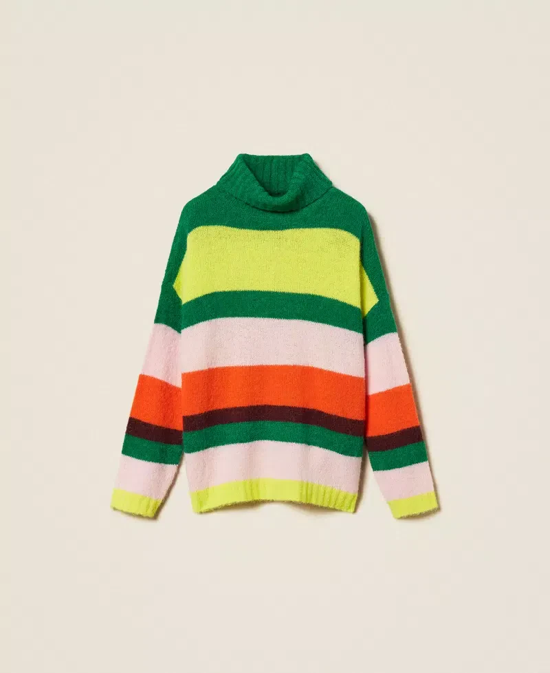 Actitude collection turtle neck jumper with multicolour stripe pattern, long sleeves, metal logo plate at the back, loose fit.