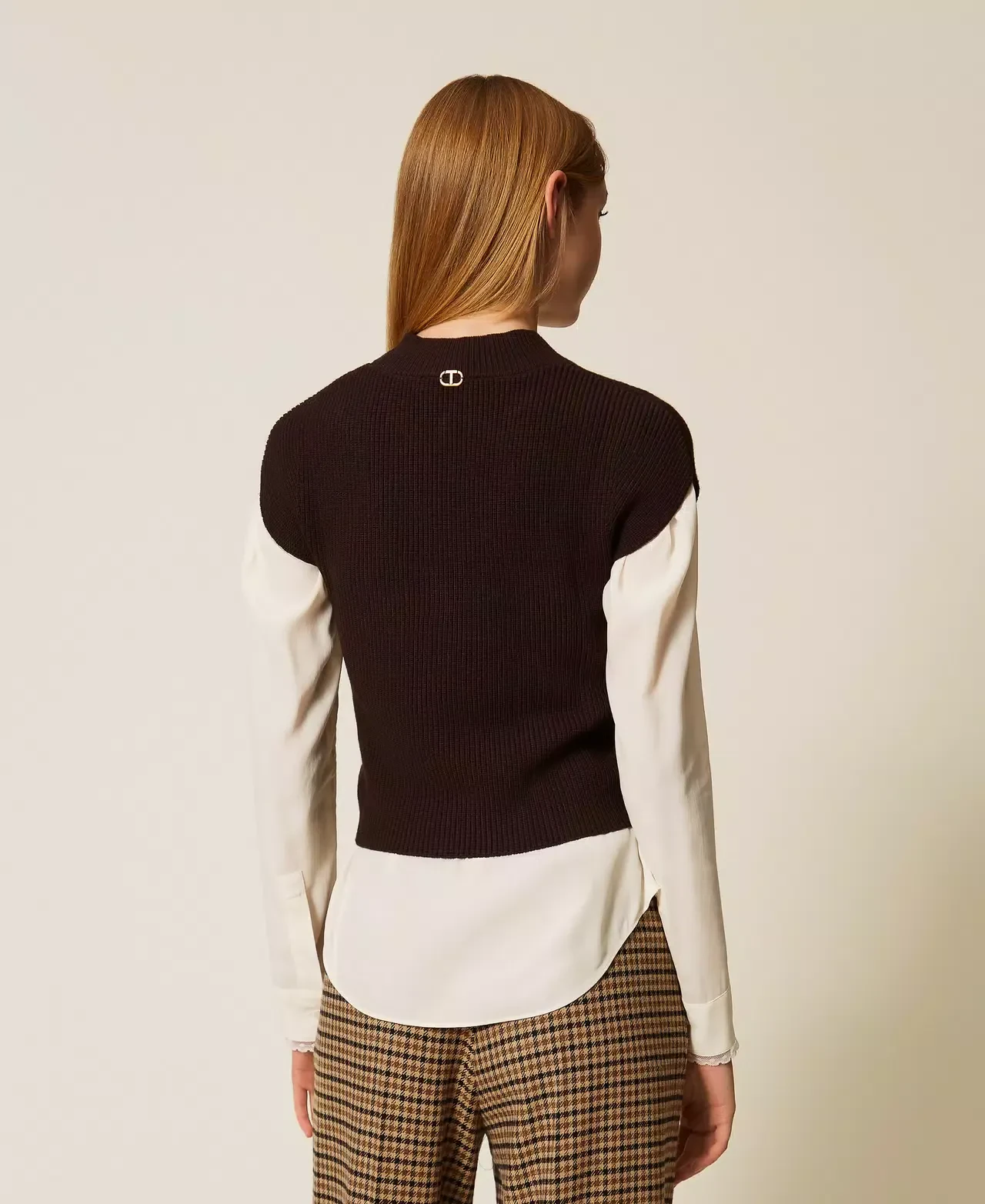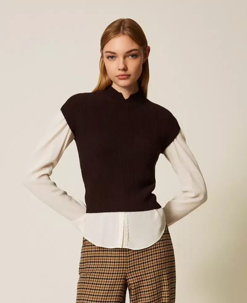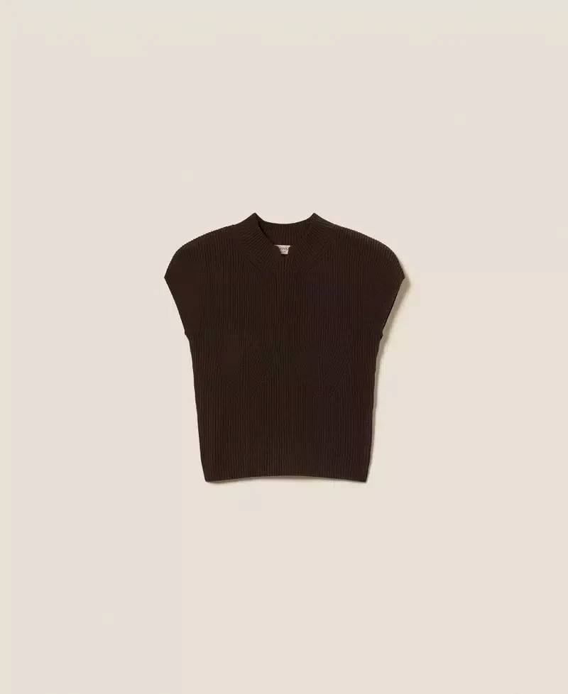Stretch viscose compact corn stitch jumper with knit patterns. Turtle neck with slit, short sleeves, Oval T logo plate on the back, fitted.