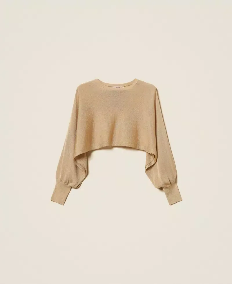 Cropped viscose and lurex blend plain knit jumper. Crew neck, wide long sleeves with cuffs, ribbed trims, wide fit.