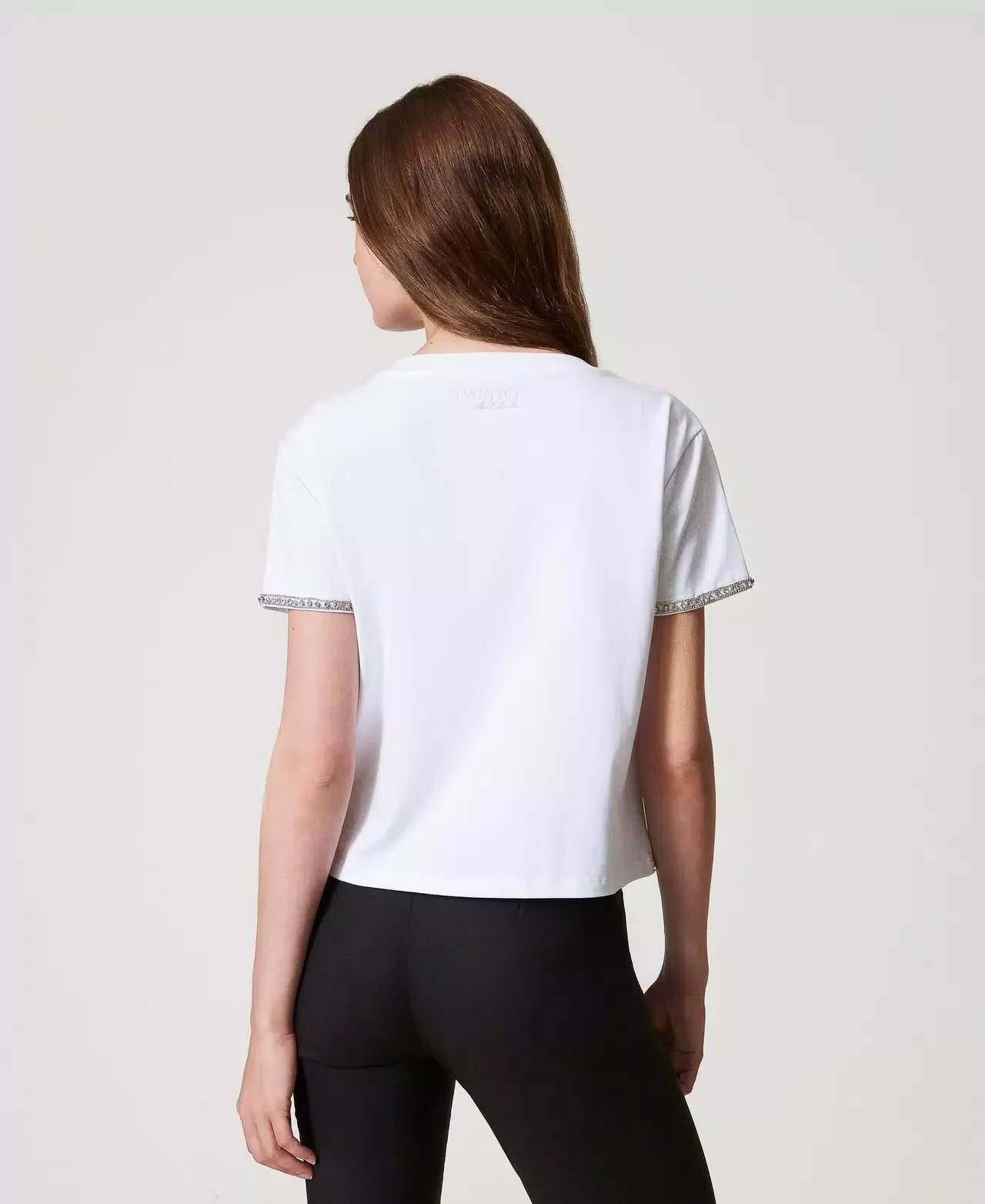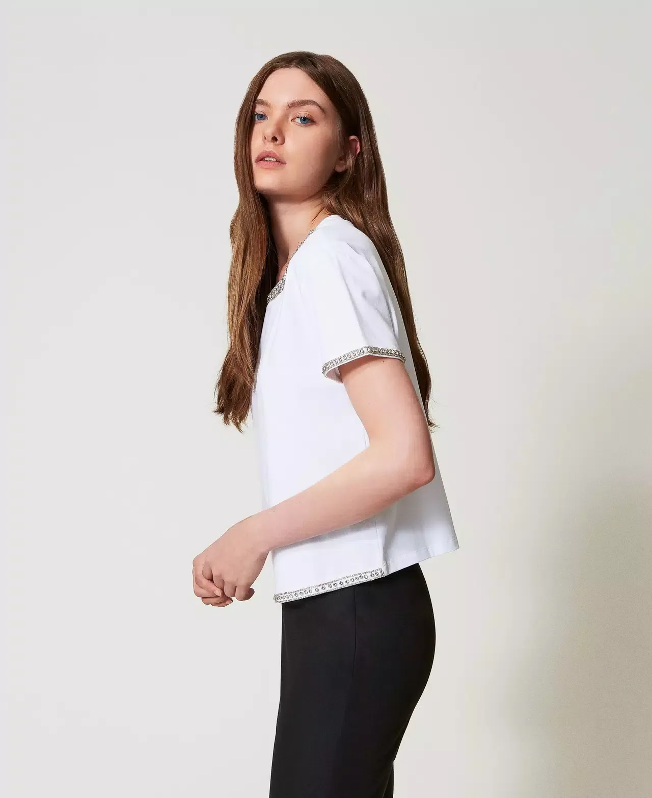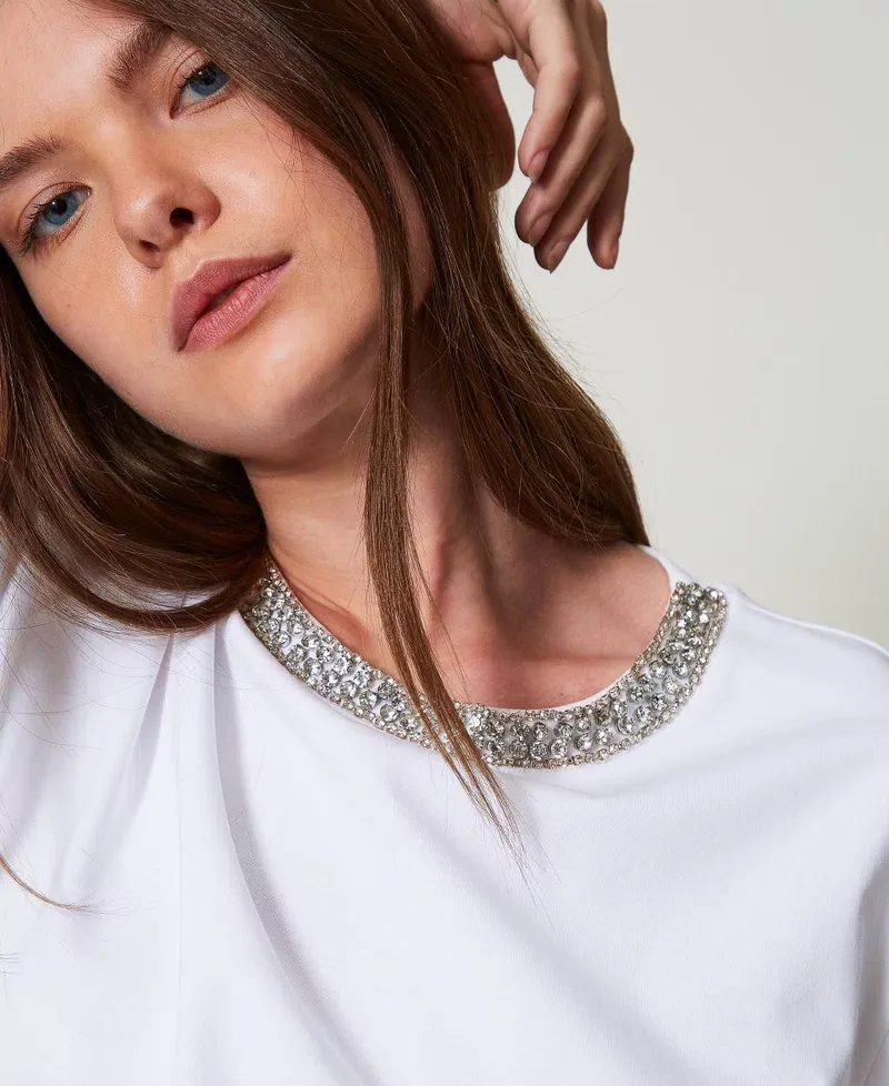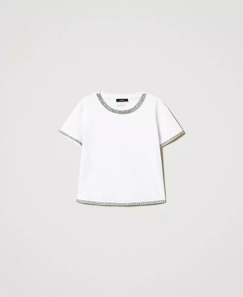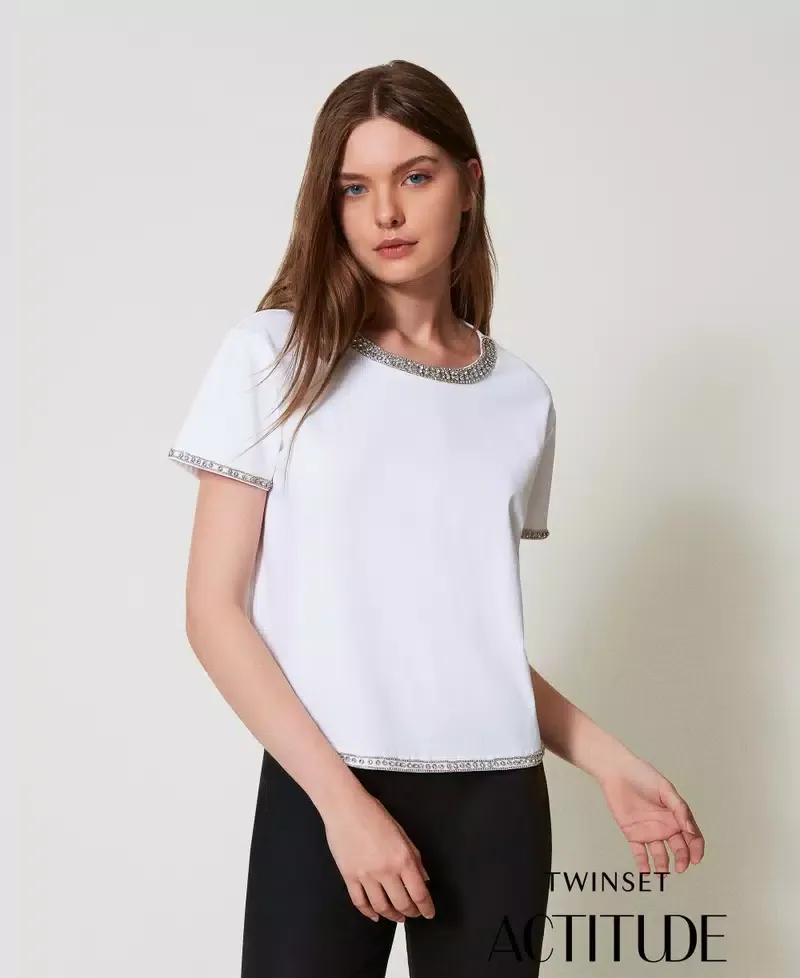 Actitude collection slub jersey T-shirt, rhinestone hand-embroidered trims, crew neck, short sleeves, boxy fit.