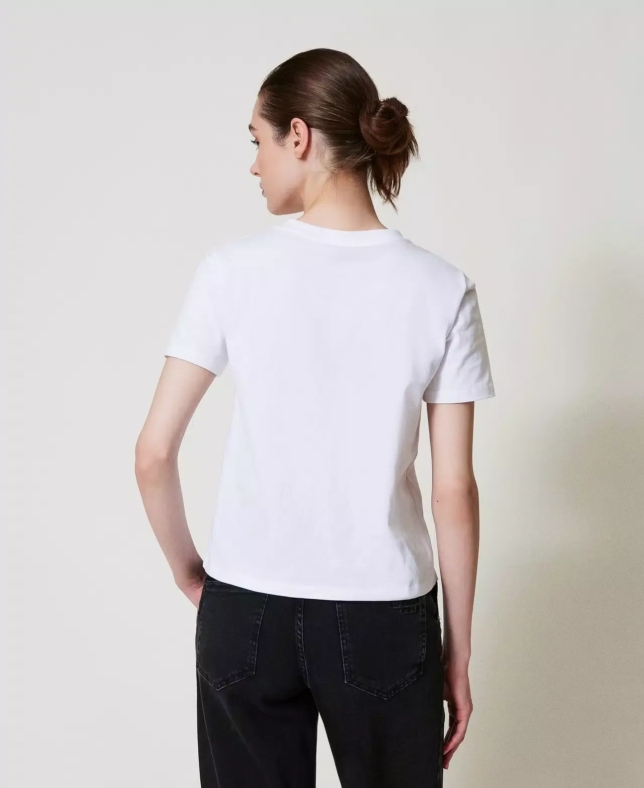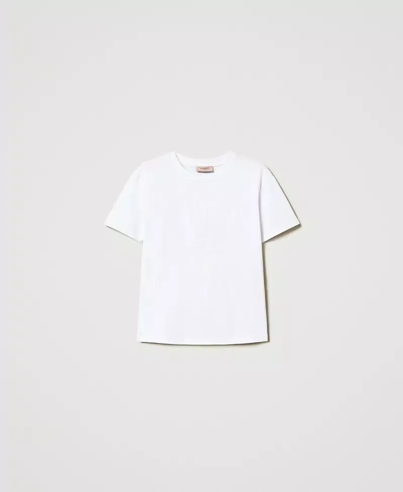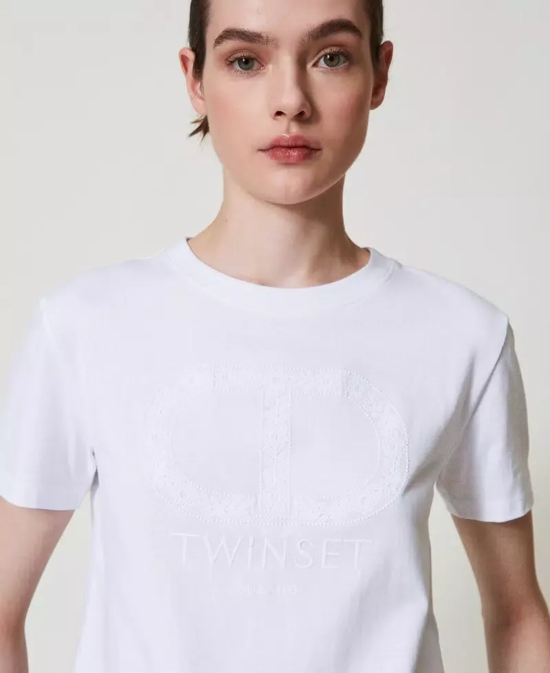 Cotton jersey T-shirt with tonal thread floral Oval T embroidery, exclusive to Twinset. Crew neck, short sleeves, regular fit.