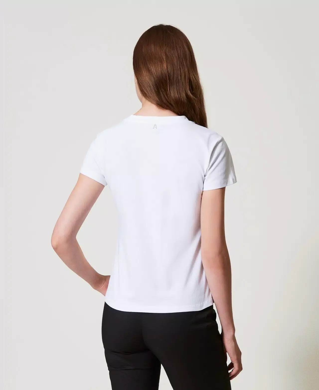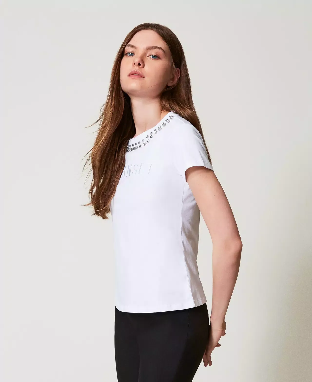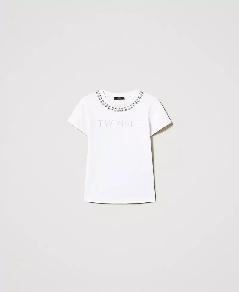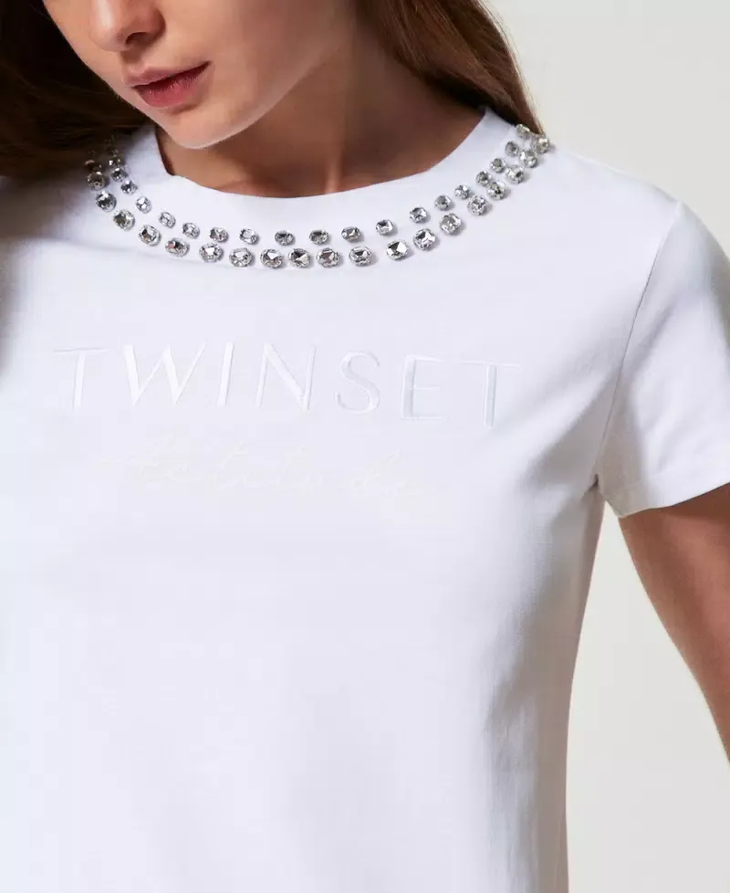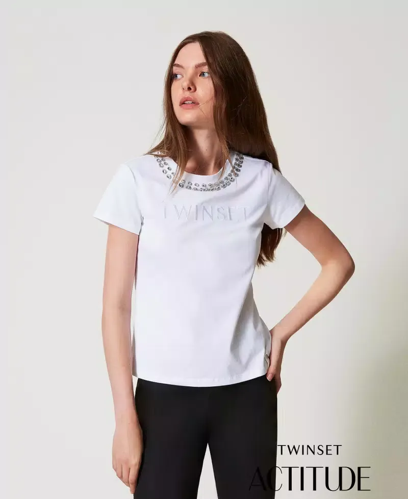 Actitude collection cotton jersey T-shirt with handmade bezel embroidery on the neckline and tone-on-tone hand-embroidered logo print. Short sleeves, slim fit.