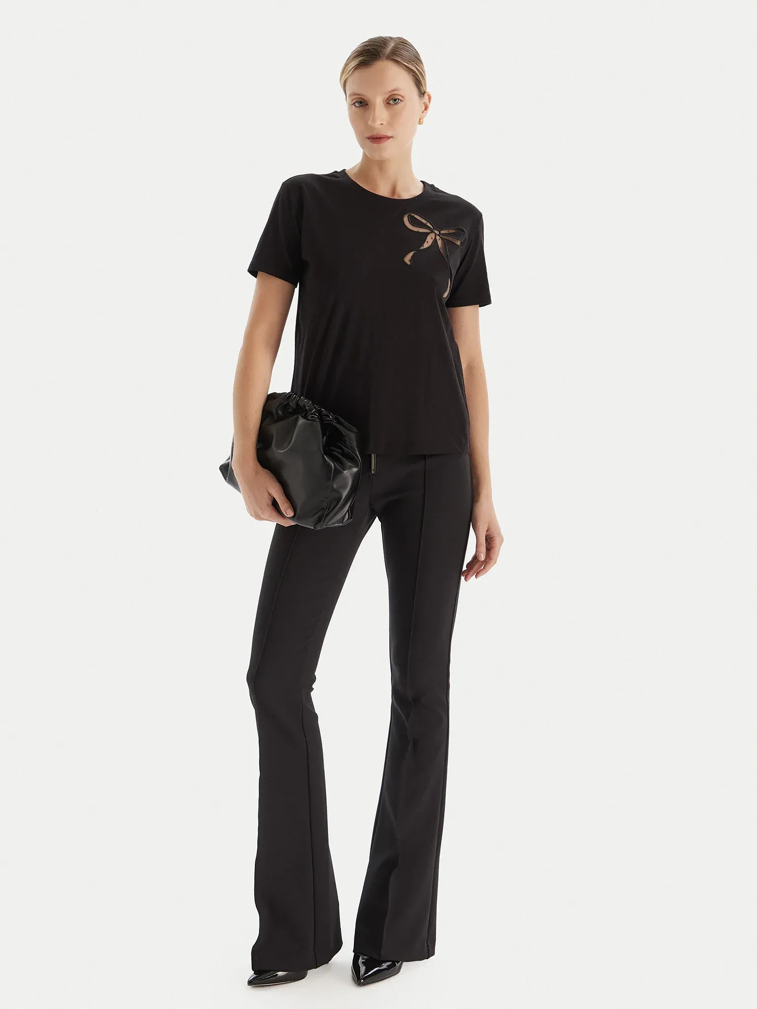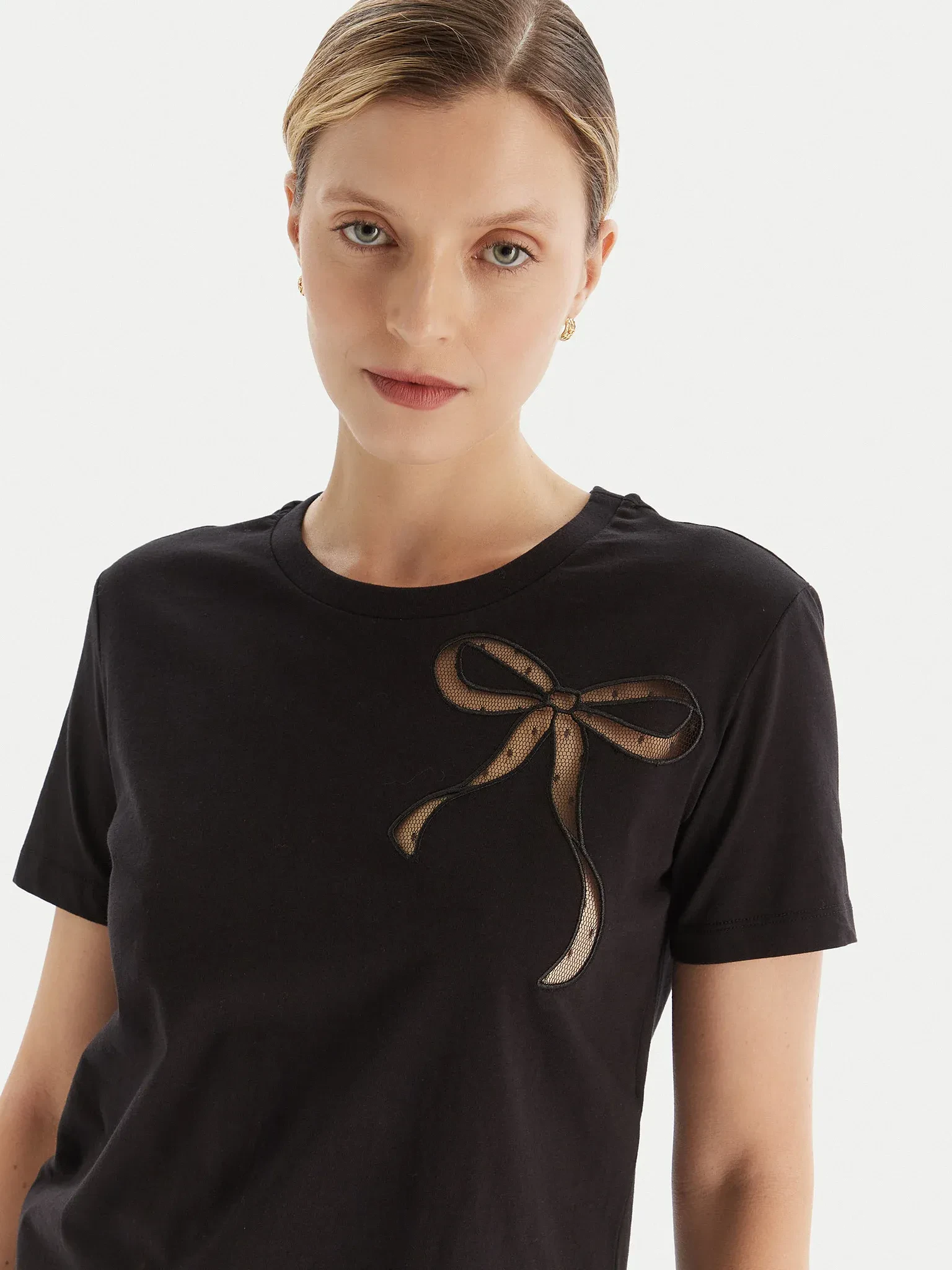 The straight cut enhances the silhouette while maintaining a comfortable and versatile fit, suitable for any occasion. The round neck and short sleeves add a classic and clean touch, while the bow detail, delicately placed on the chest, catches the light with an essential but distinctive graphic.