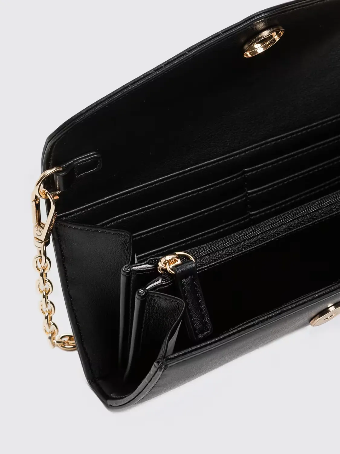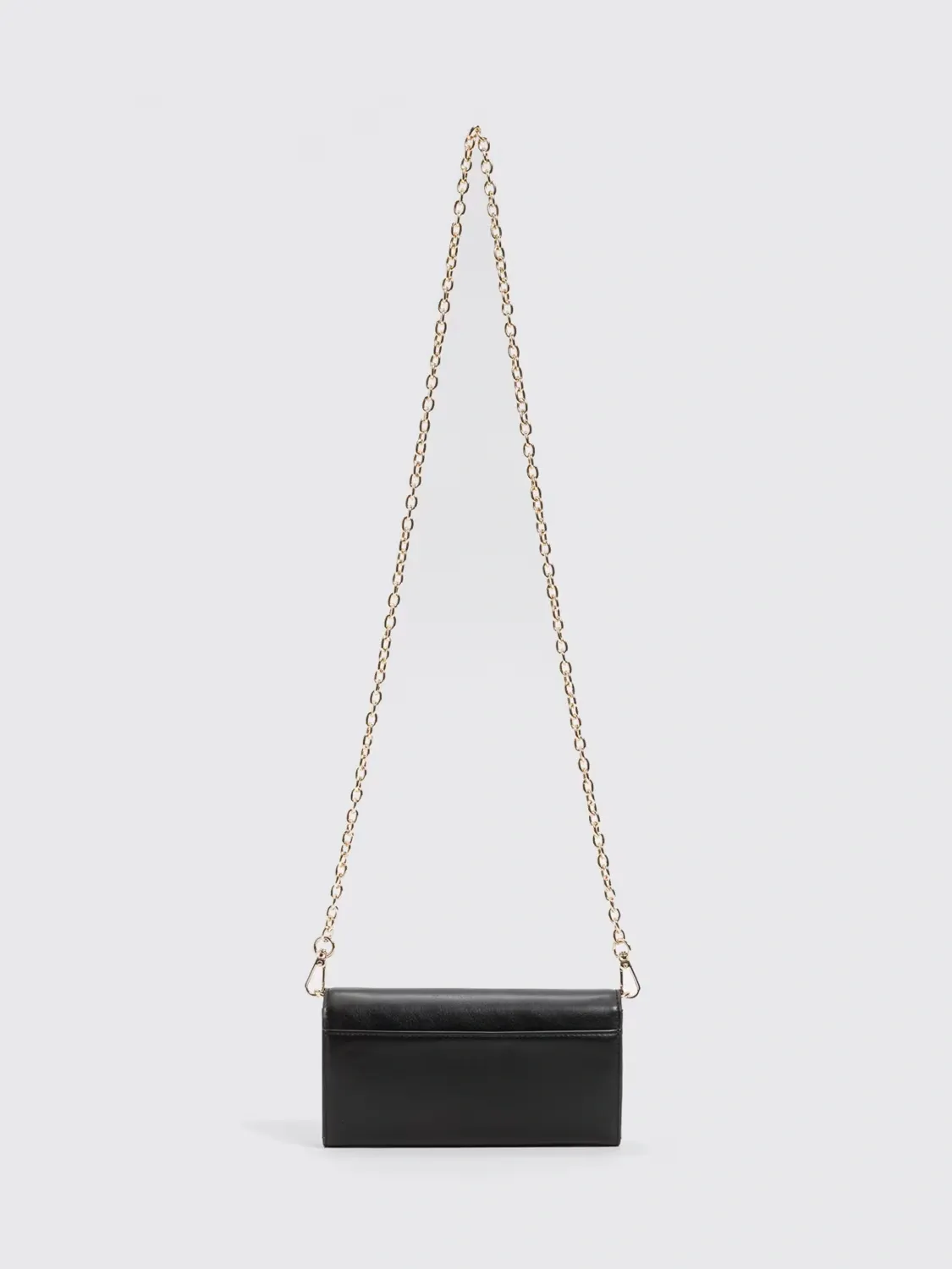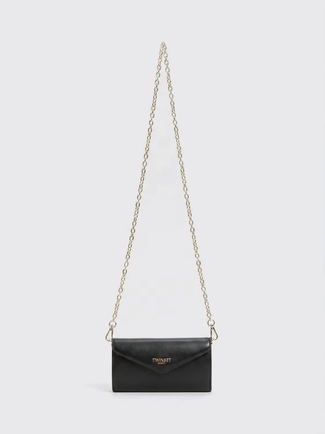 Smooth faux calf nappa leather mobile phone holder with metal lettering logo. Flap and button closure, removable chain strap, internal compartments.
