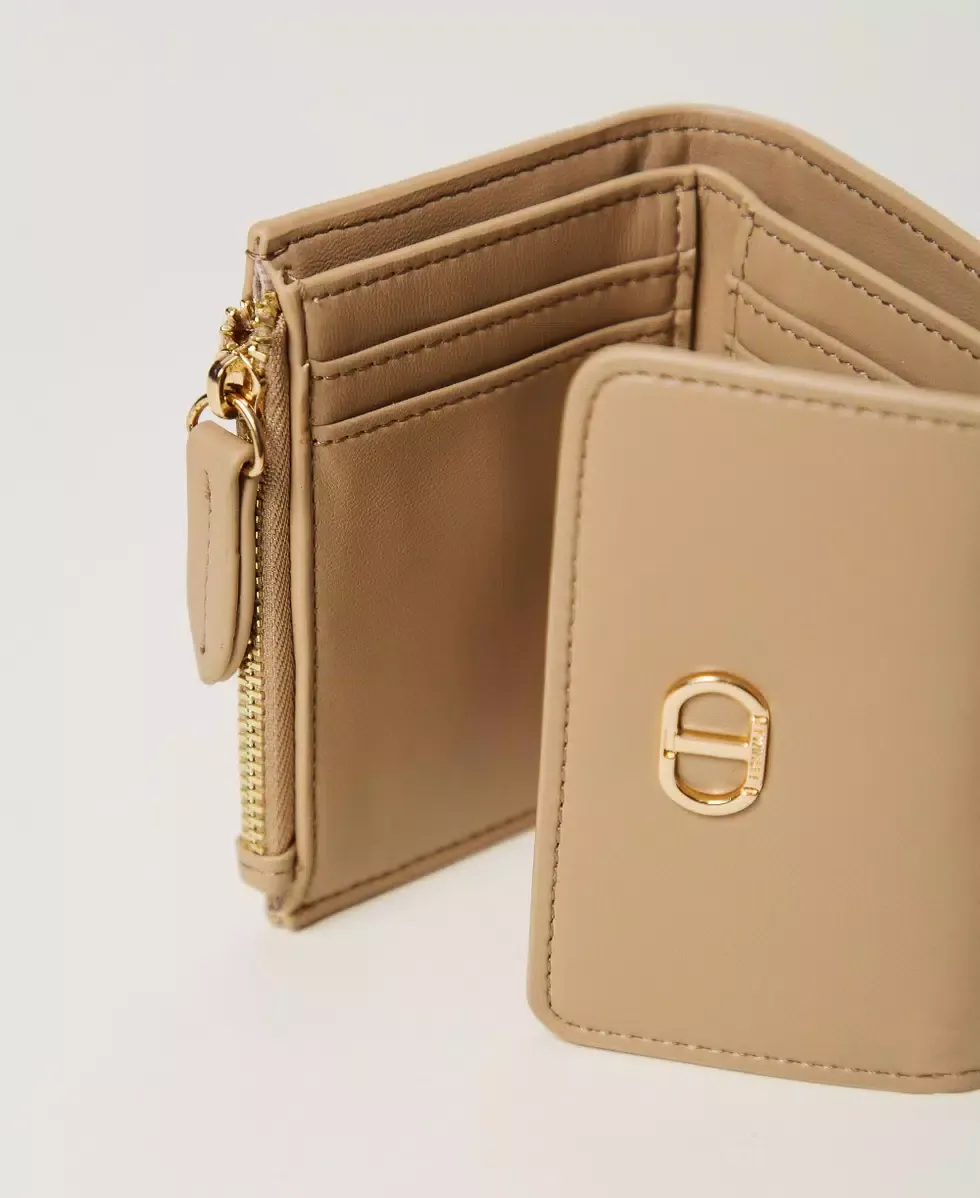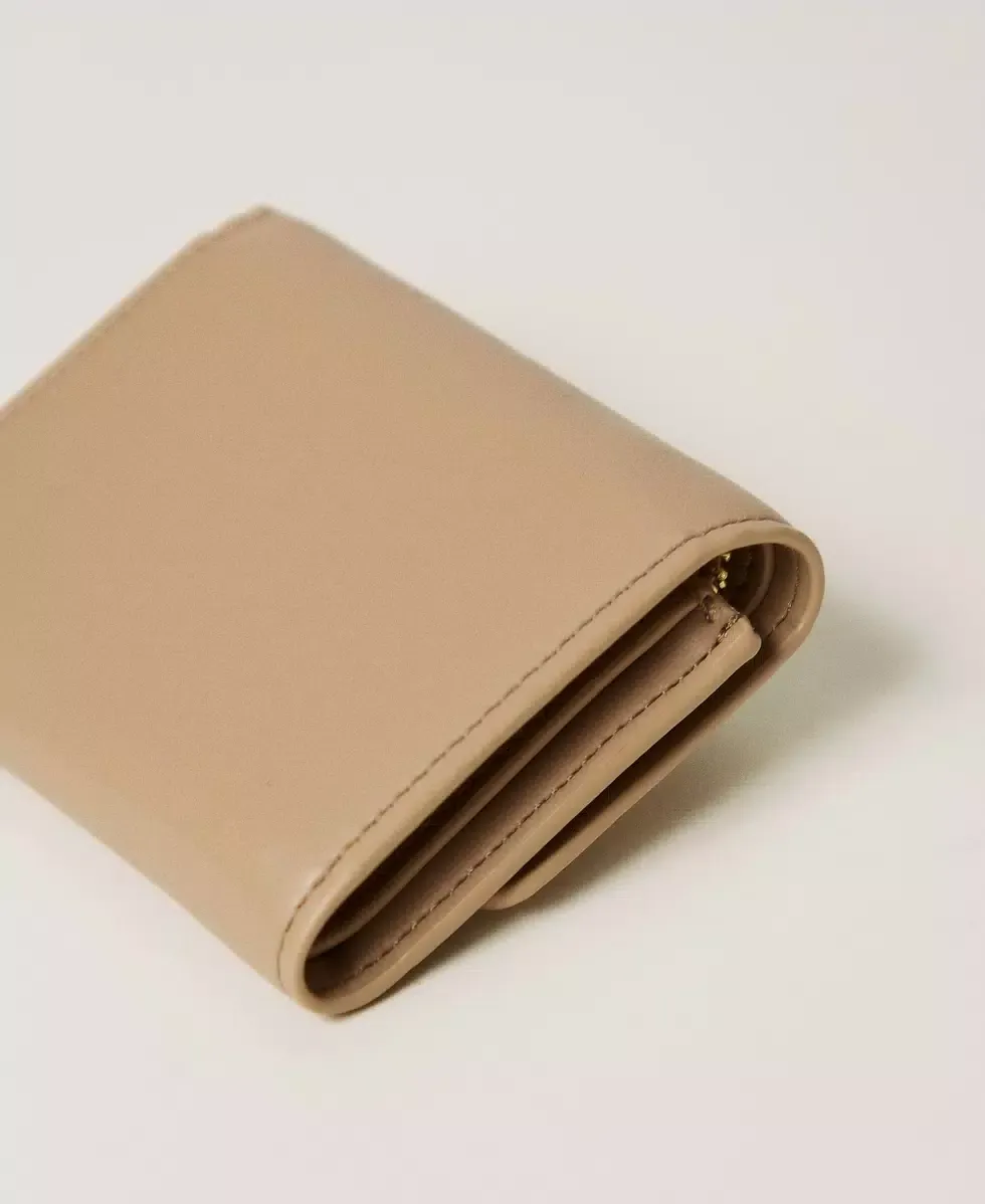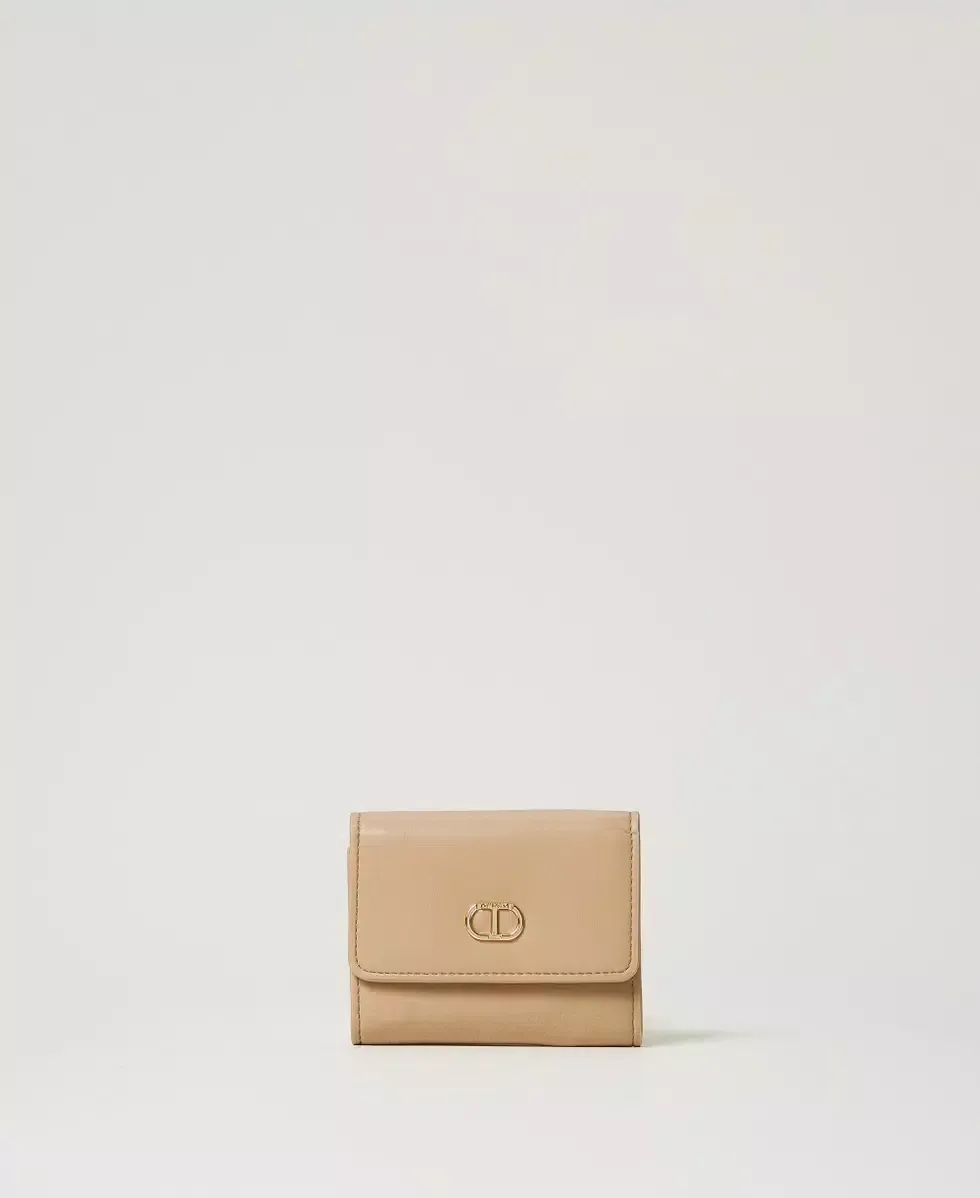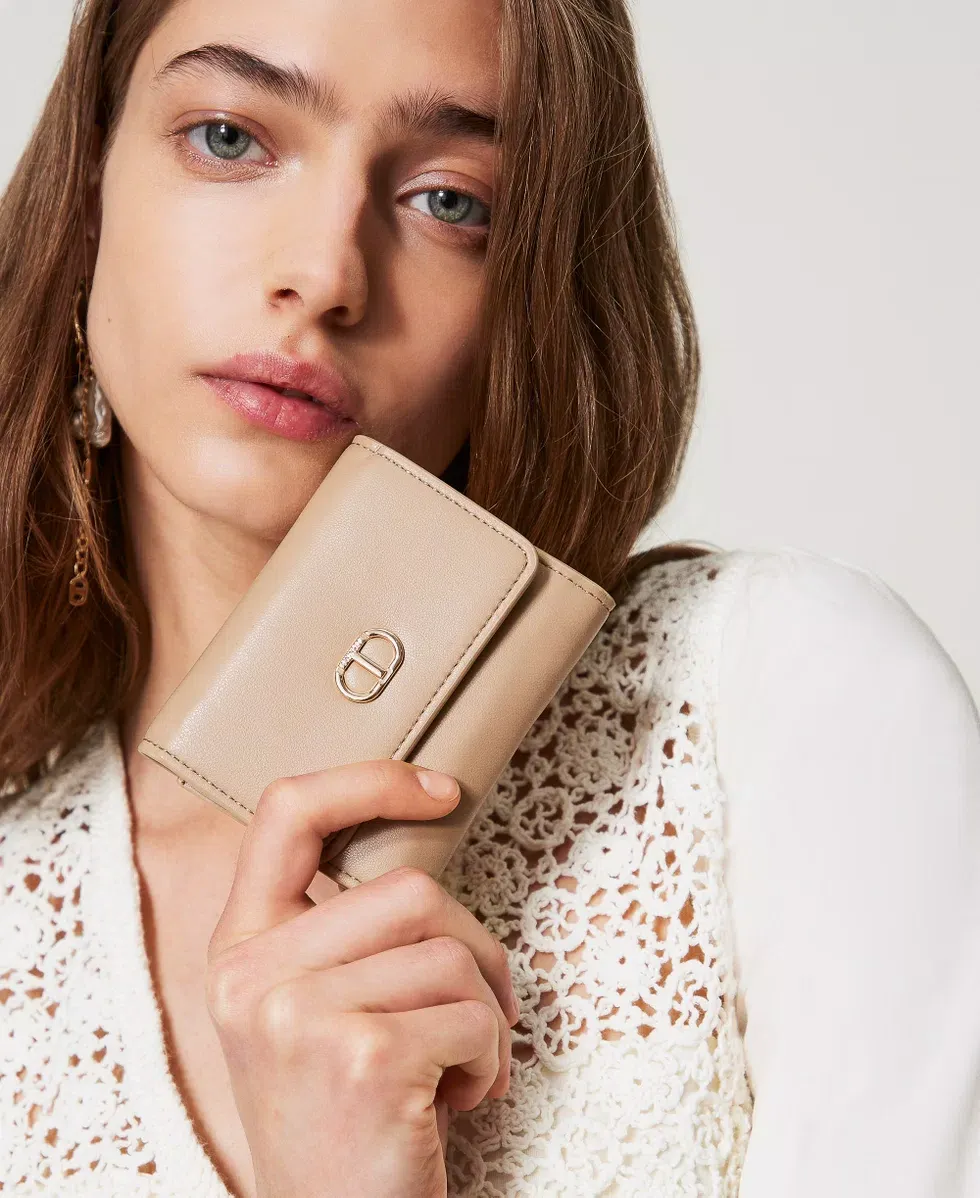 Small smooth faux calf leather wallet with flap and snap button closure, metal Oval T logo, internal compartments for cards and coins.