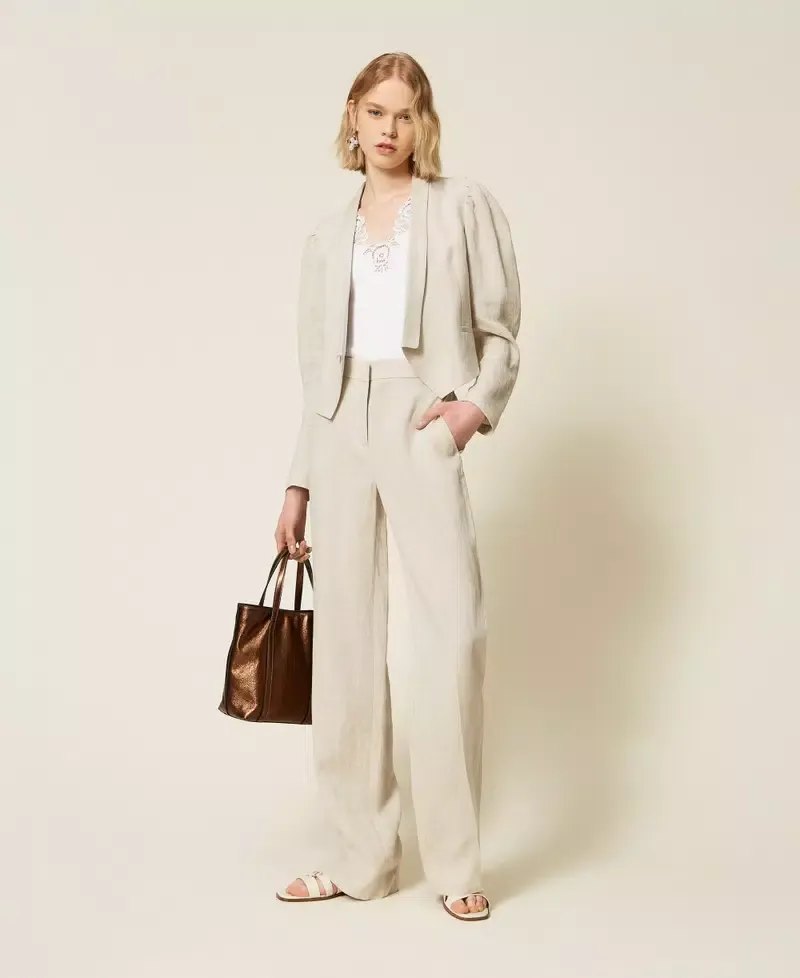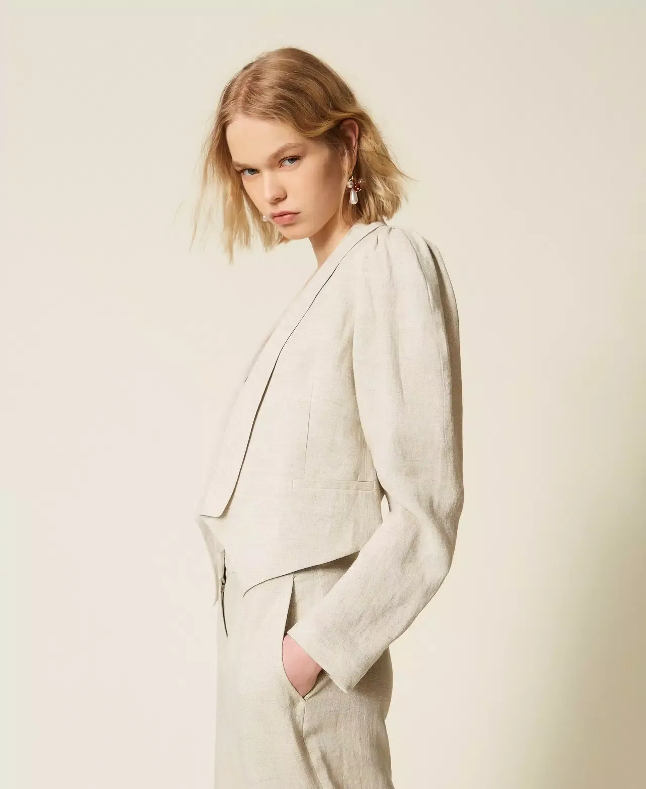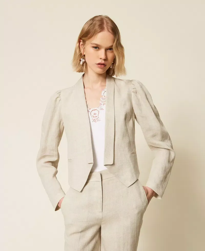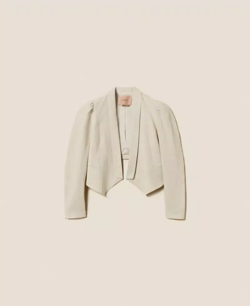 Cropped jacket made in Italy from natural linen with lurex that creates a soft light effect. Shawl lapel inspired by tuxedo jackets, edge-to-edge front, long sleeves gathered at the armholes, lining, slim fit.
