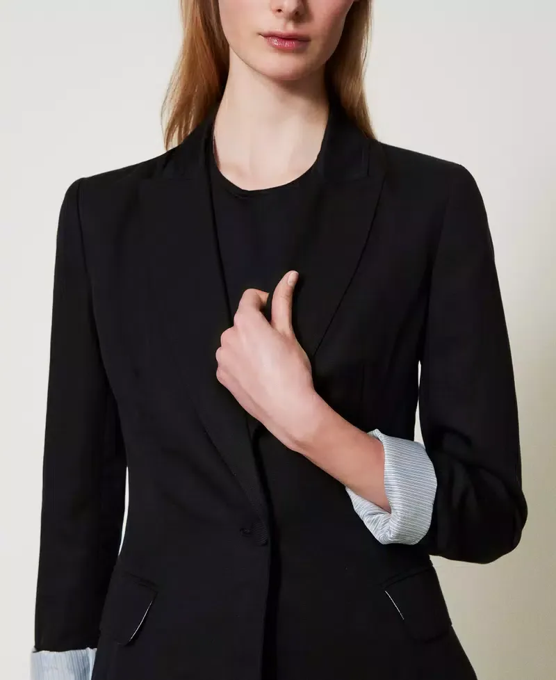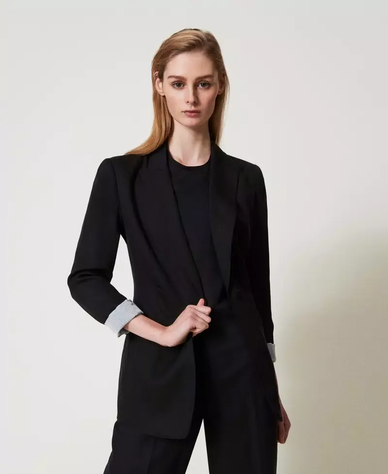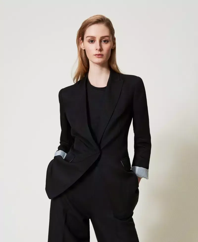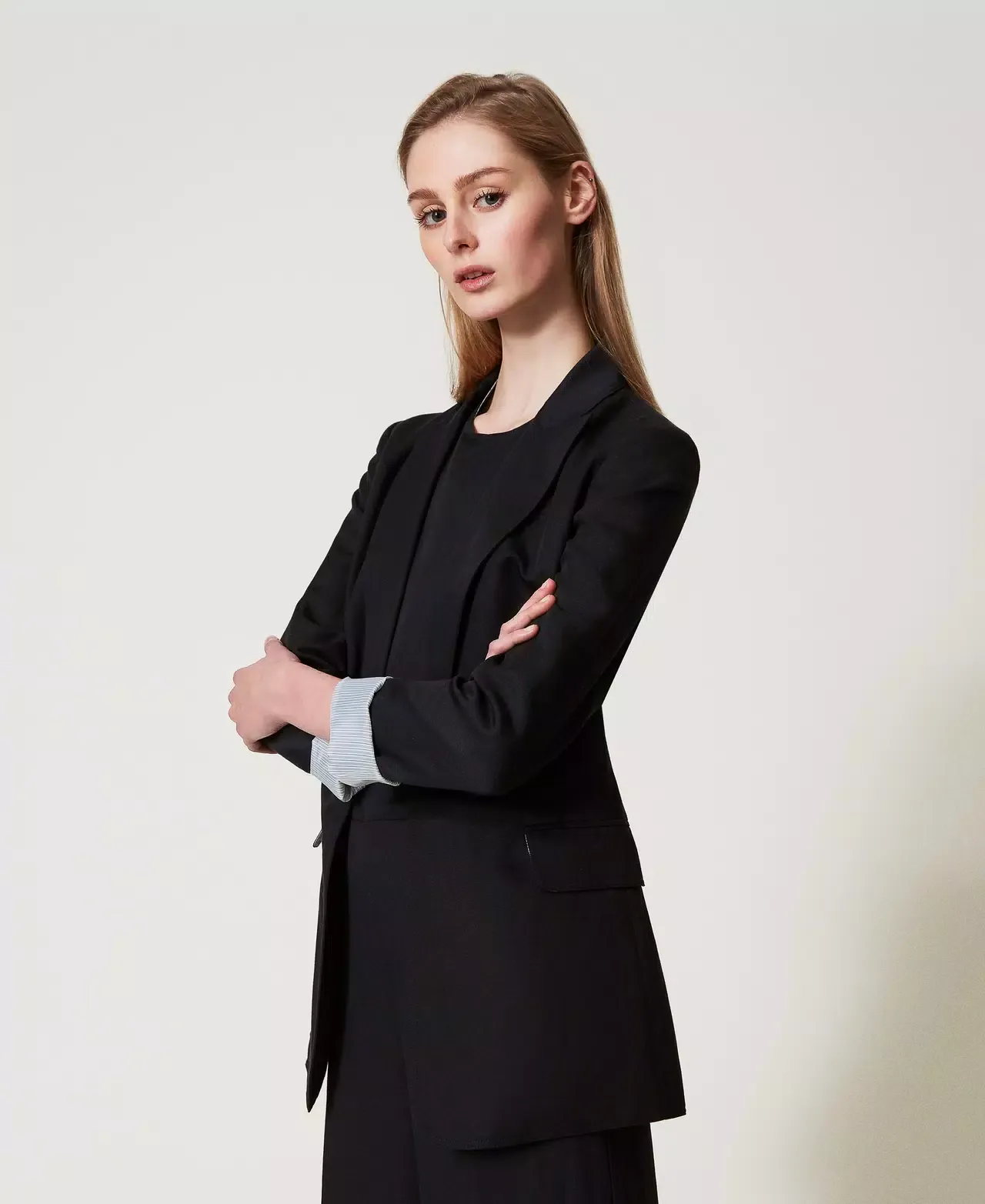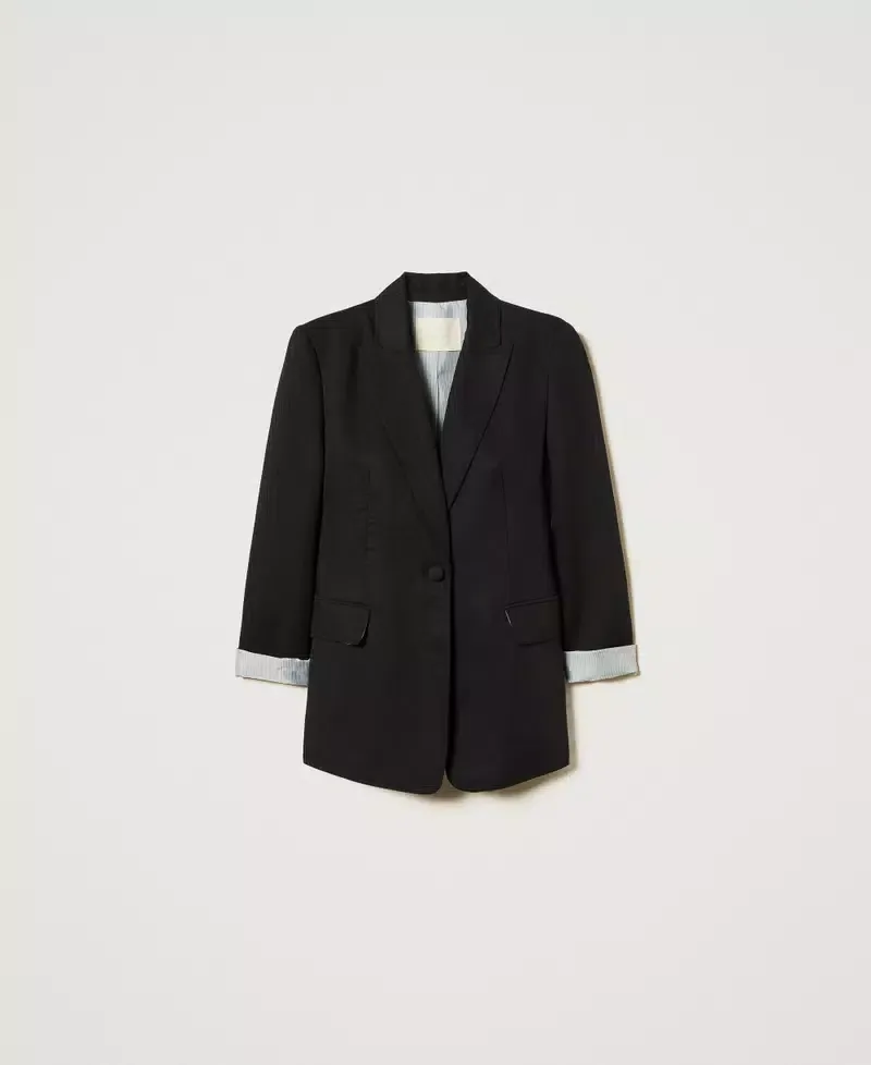 Linen and TENCEL(TM) blend blazer with slanted construction and comfortable hand feel. Pointy collar lapels, covered button fastening, long sleeves with shoulder pads, pleats that emphasise the waist, welt pockets with flaps, Oval T logo plate on the back, striped silk lining, straight fit. This item is part of the “Archive” range, inspired by the most iconic and most loved garments from the Twinset collections. The viscose used for this item (57% Viscose) generates lower emissions and uses less water than average viscose.