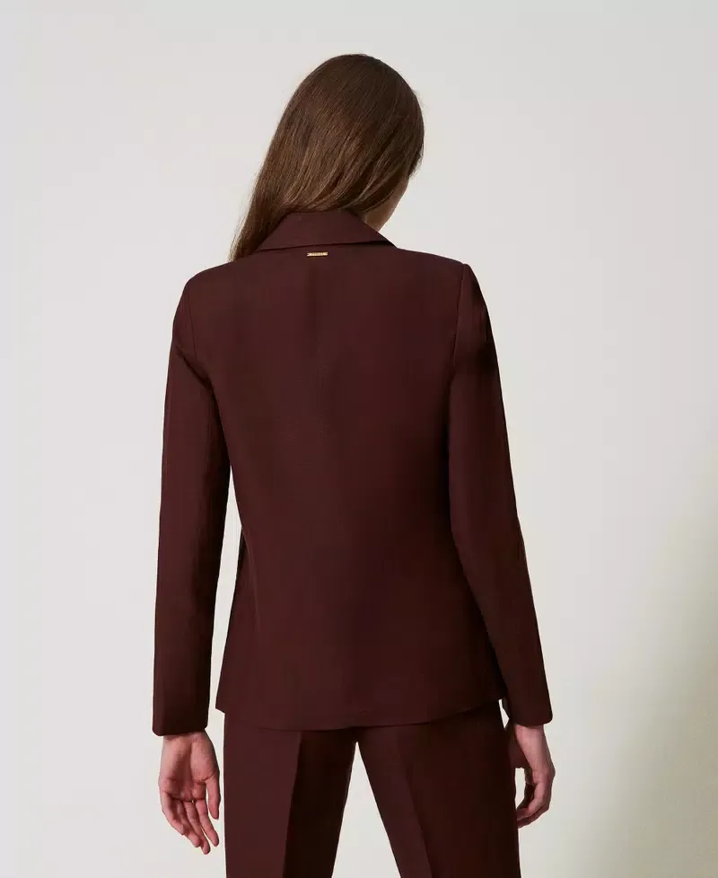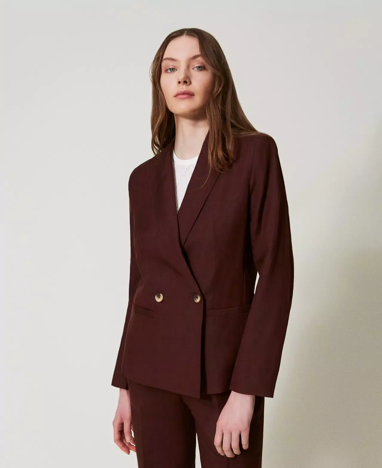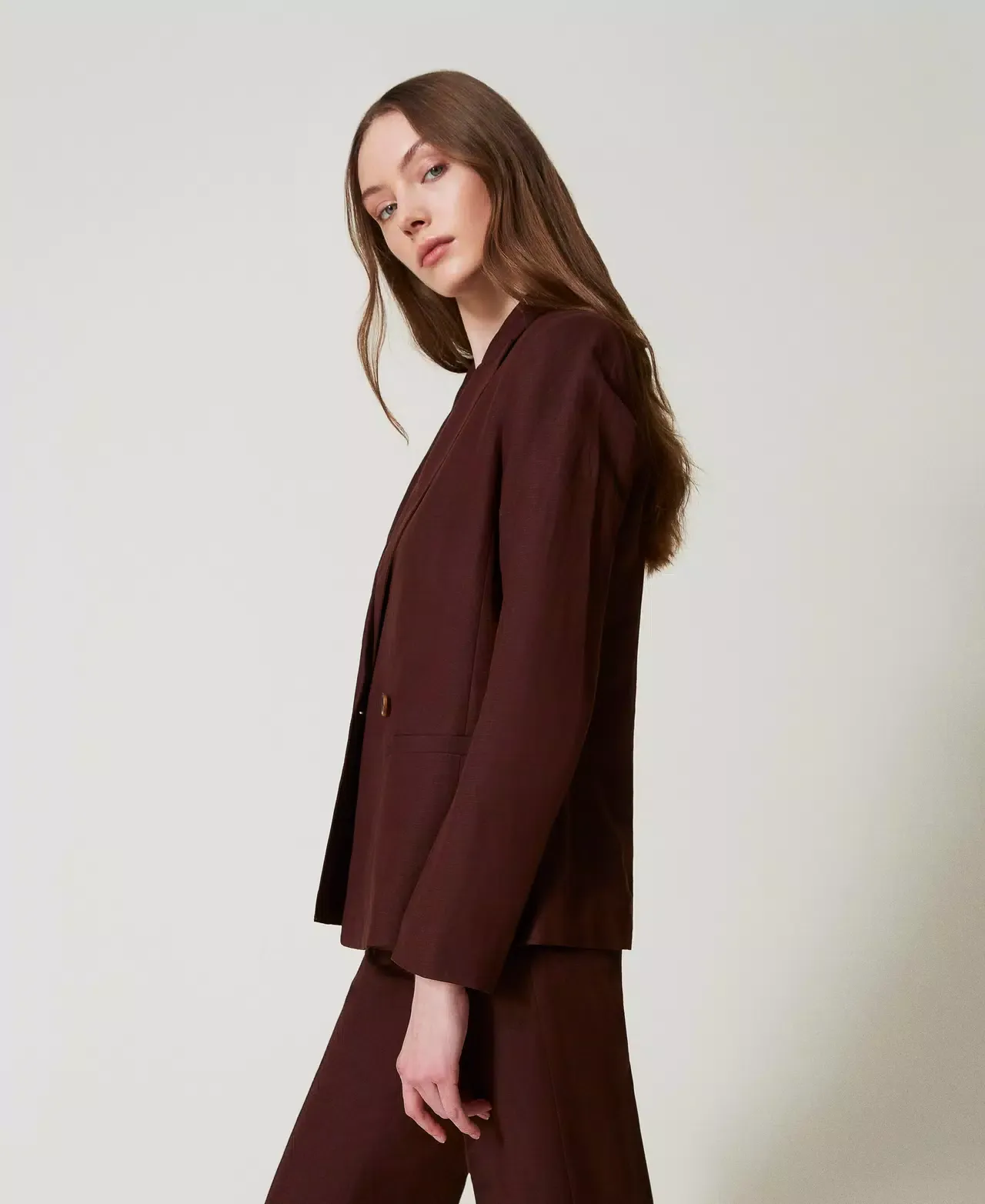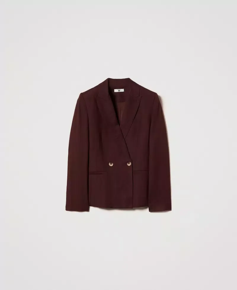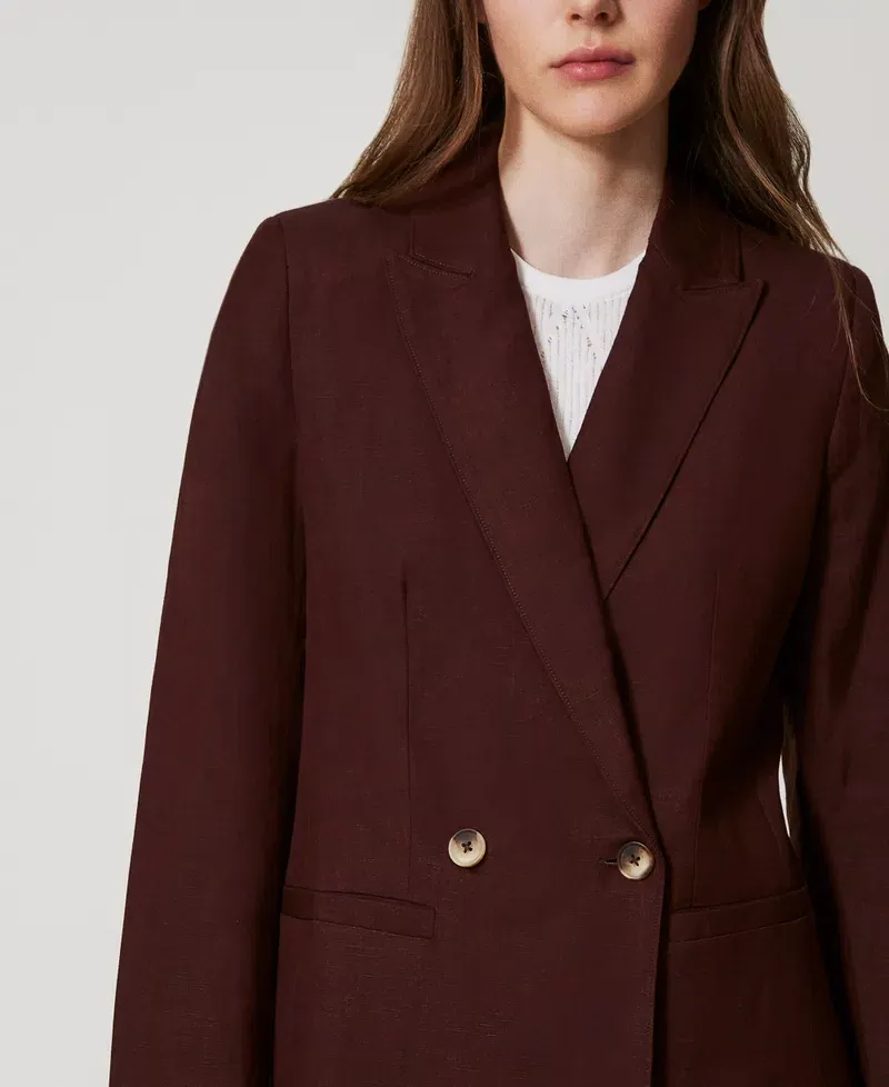 Linen blend double-breasted blazer with pointy lapels, two buttons, front welt pockets, long set-in sleeves. Side front seams, central seam on the back. Lining, logo plate on the back.