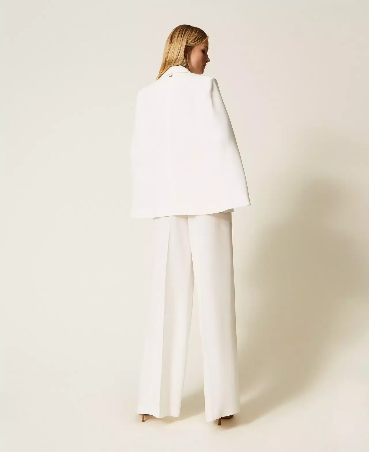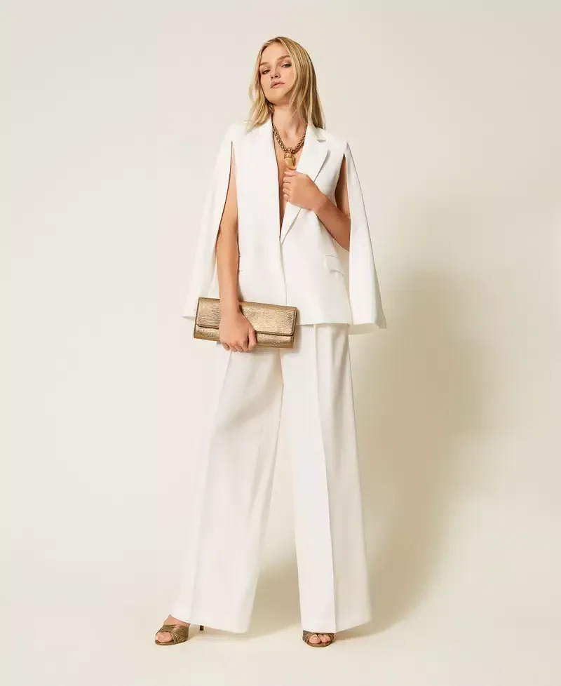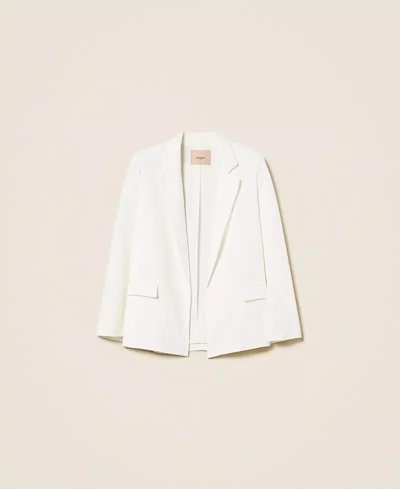 Crêpe jacket with cape effect wide open sleeves, double welt pockets with flap, lining, Oval T logo plate on the back, wide fit.