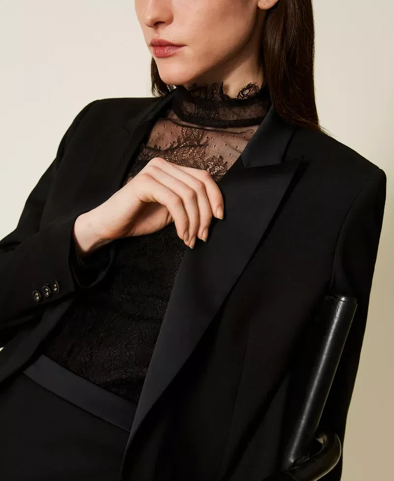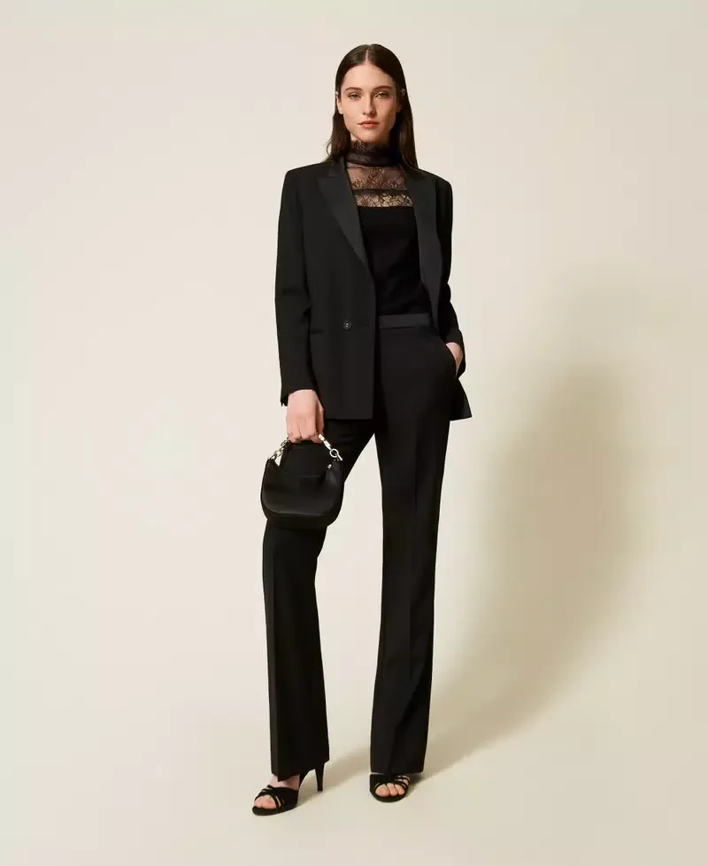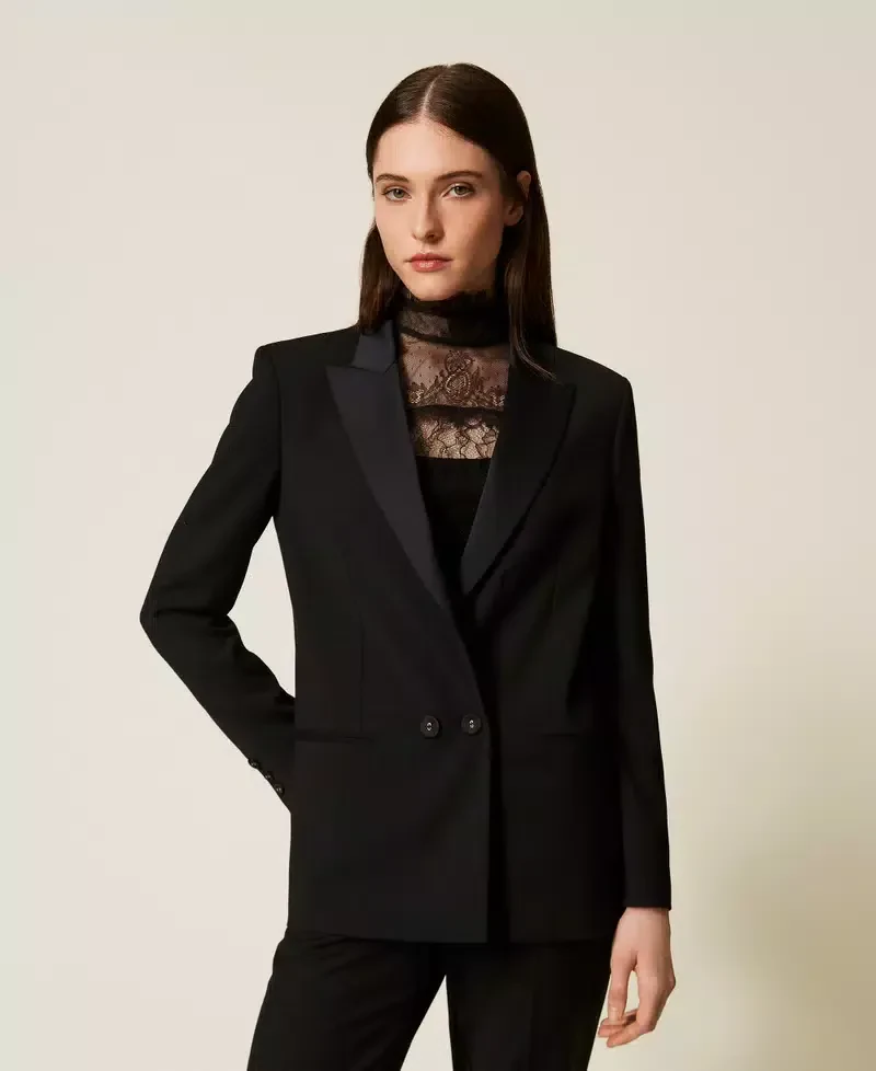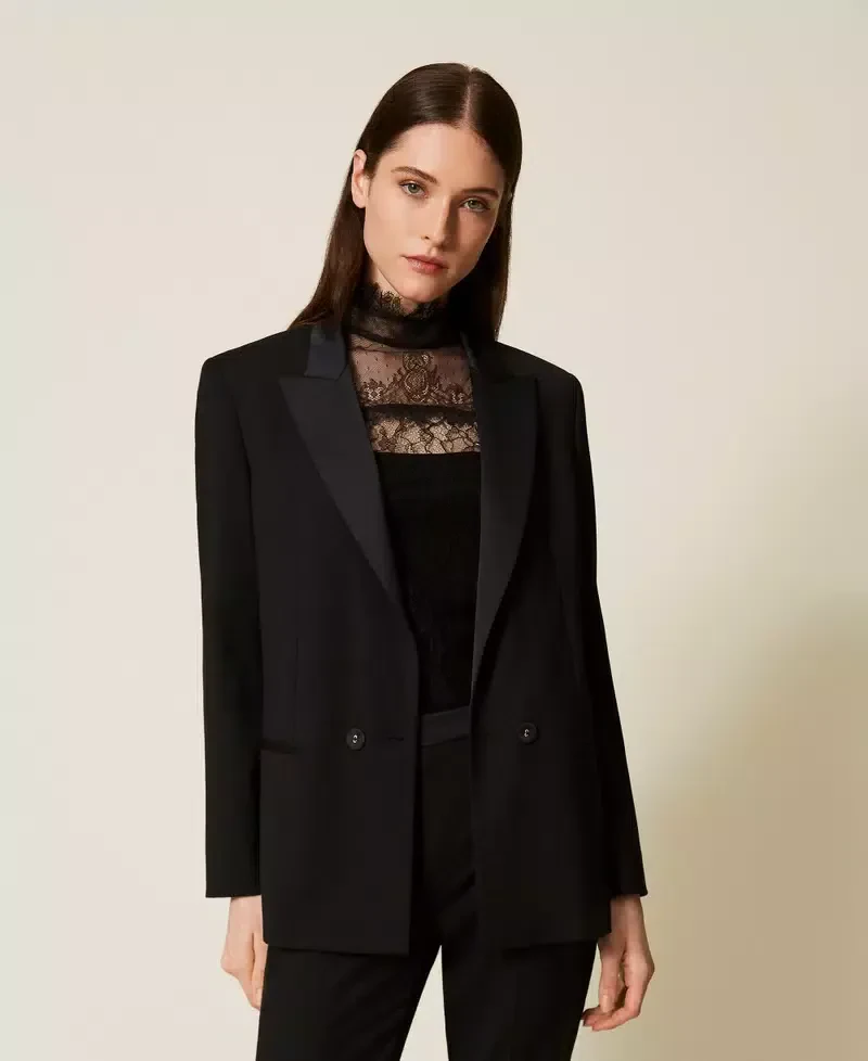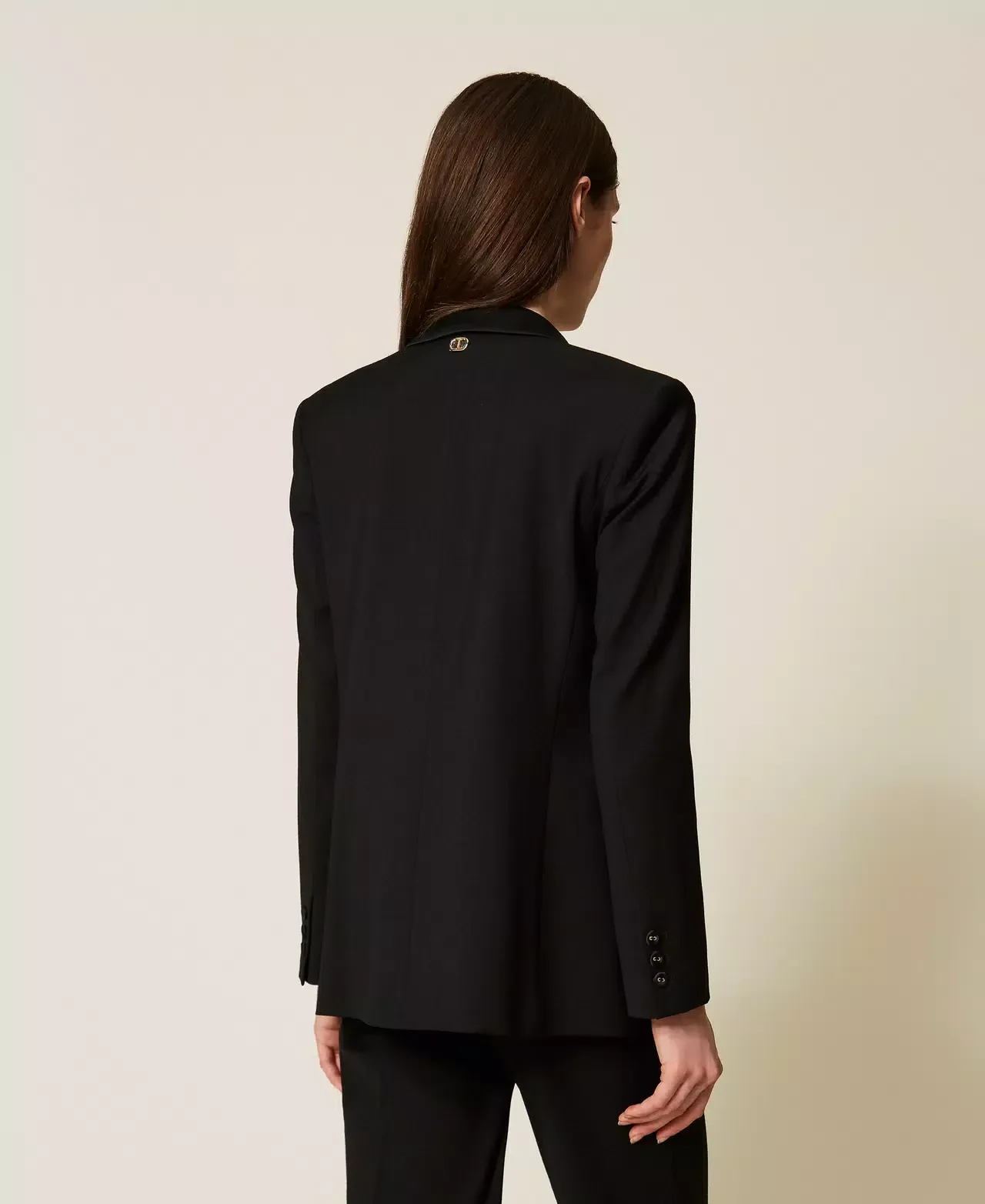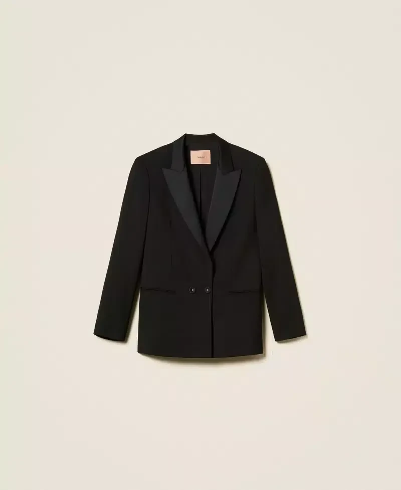 Wool and viscose blend twill blazer with satin lapels and collar. Long sleeves with buttons at the cuffs, double welt pockets, button fastening, lining, Oval T logo plate at the back, straight fit.