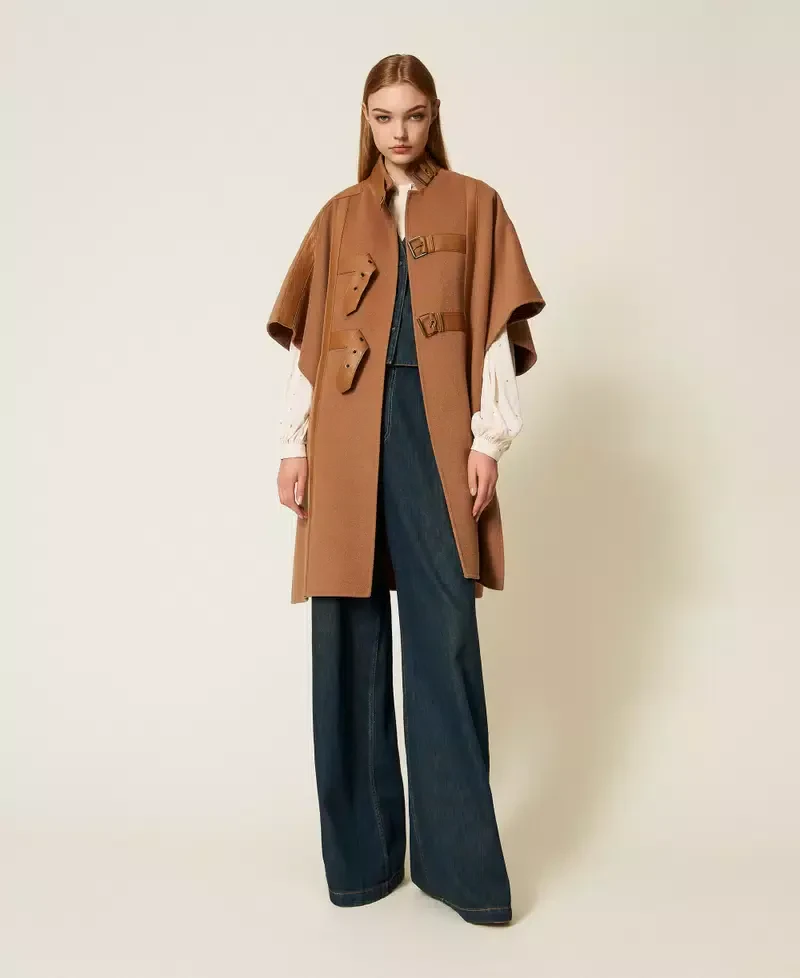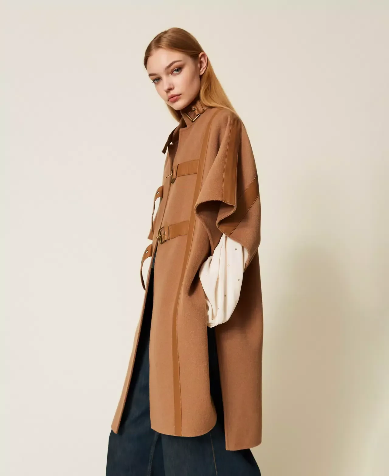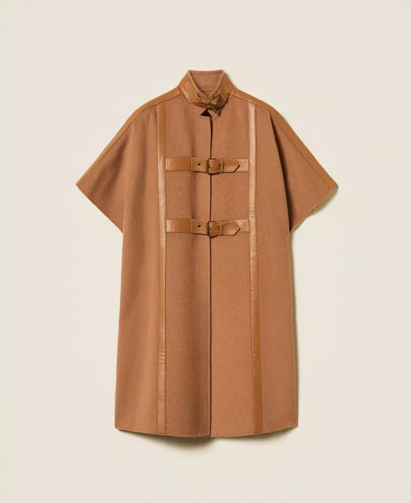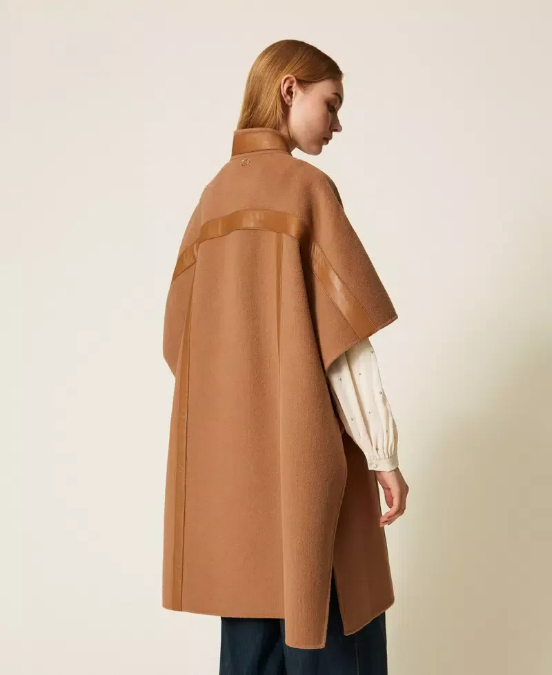 Doubled wool cape with faux leather details. High neck, strap and buckle fastening, short kimono sleeves, side slits, wide fit.