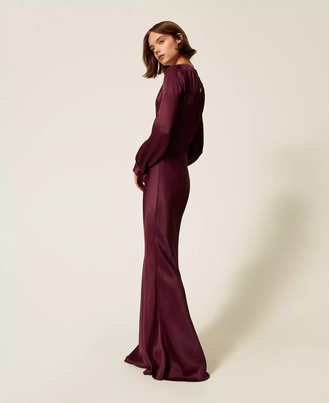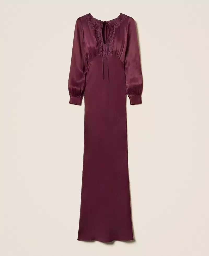 Long viscose satin dress with thread embroidered tulle decorating the neckline. Teardrop opening fastened with a bow, long sleeves buttoned at the cuffs, back zip fastening, Oval T logo plate at the back, fitted.
