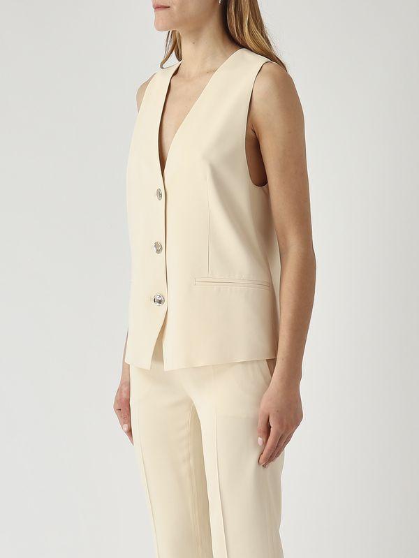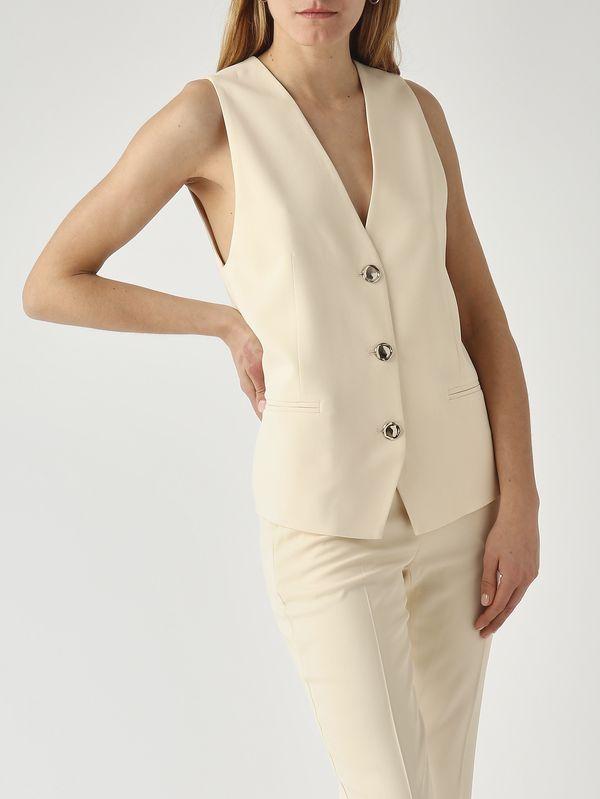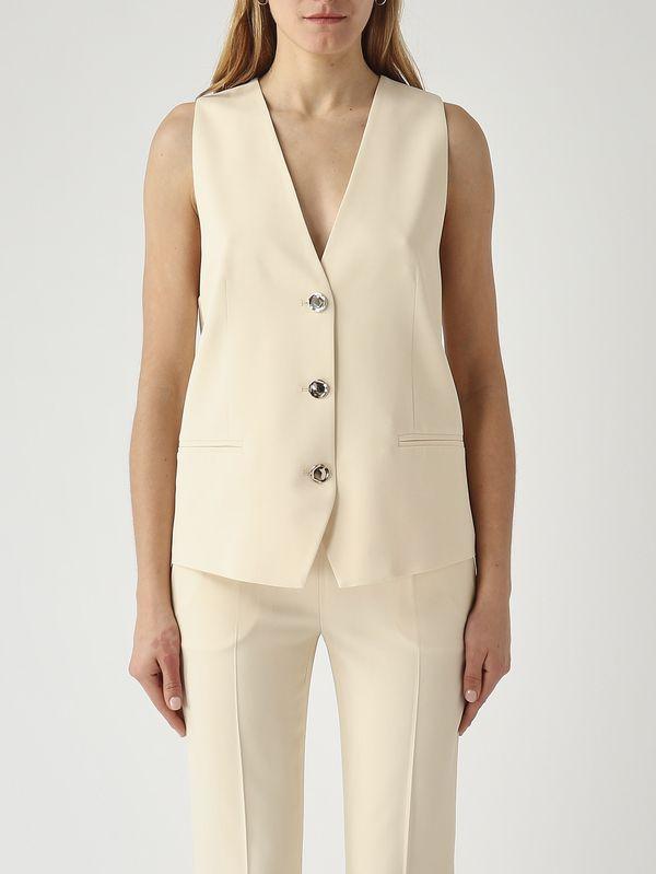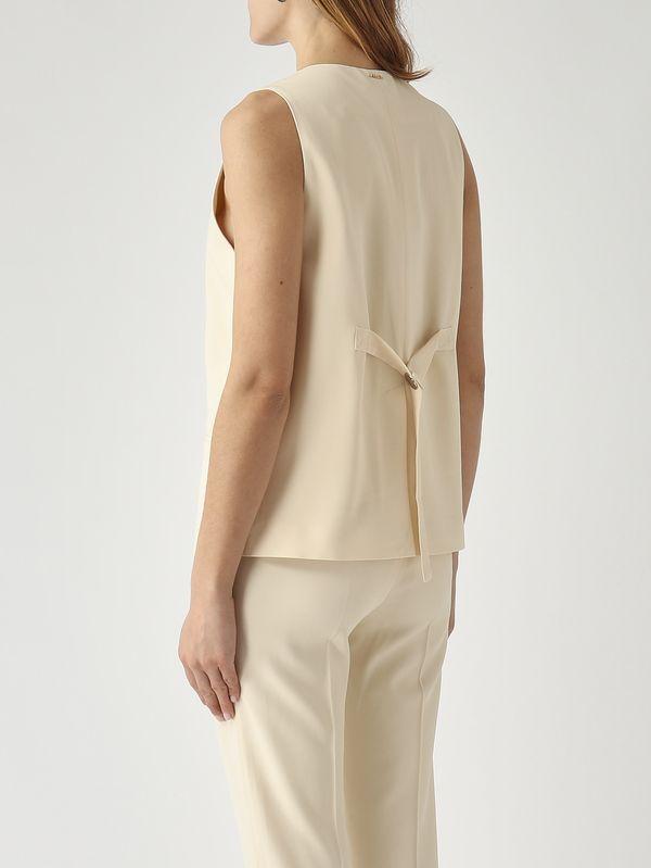 It features a clean design, shiny buttons, piped front pockets, and a back belt to accentuate the waist.
