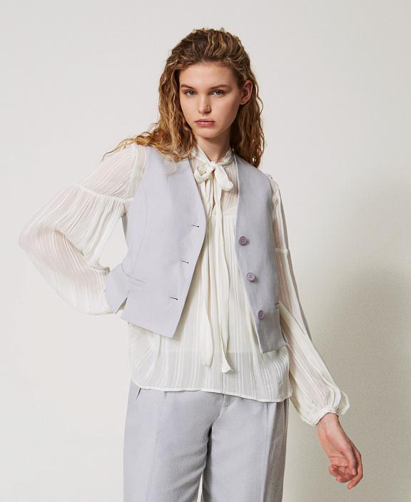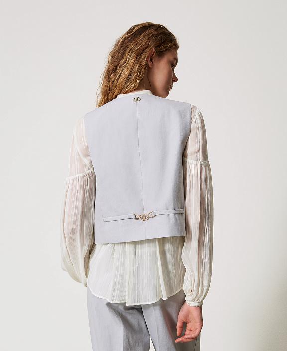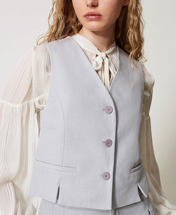 This single-breasted cotton-linen twill vest features a clean cut and a soft texture. The natural composition provides comfort and the subtle texture characteristic of fine summer fabrics. The straight-leg silhouette with a V-neck and button closure subtly accentuates the waist. Welt pockets are located at the front, while the back features an adjustable tab with metal hardware for a precise fit.