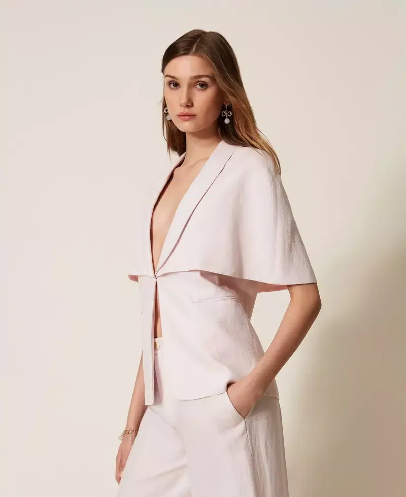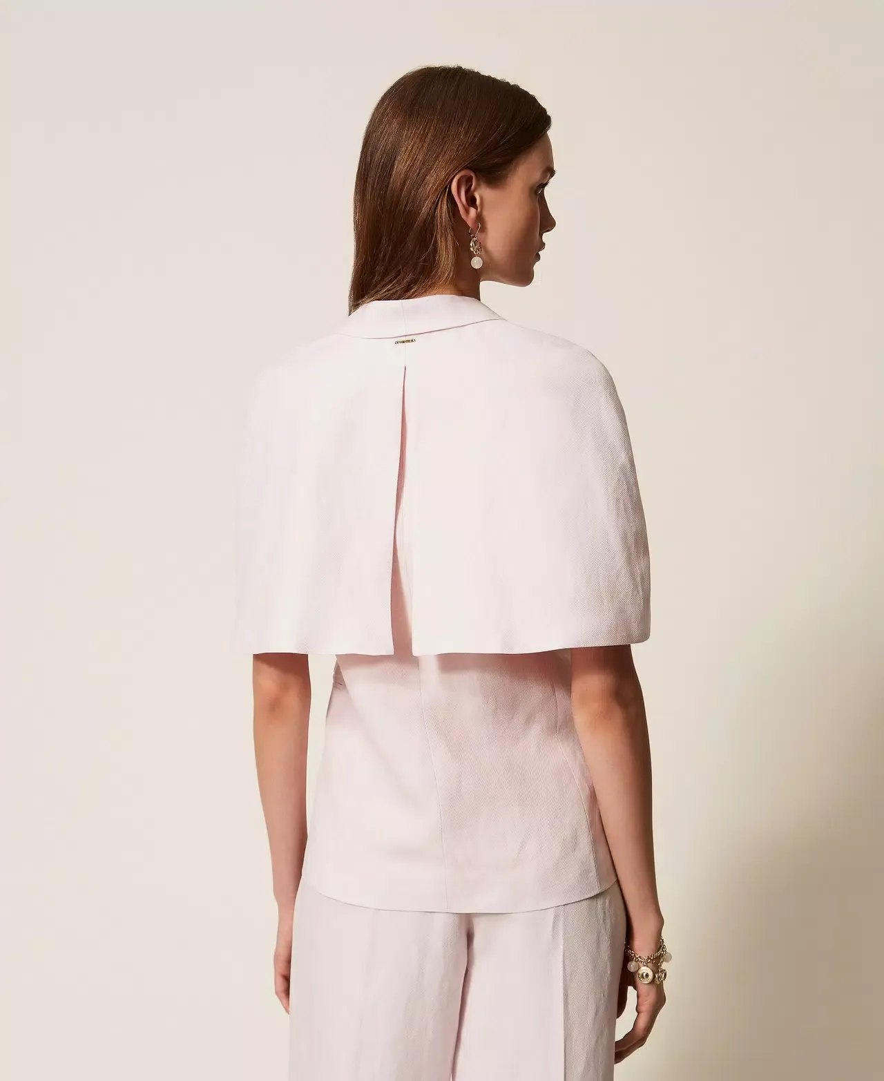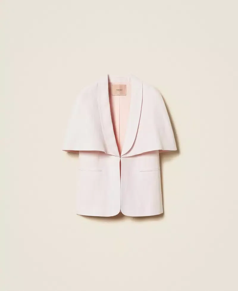 Linen blend twill jacket. Cape style with short sleeves and shawl neck, fitted fastening with hook at the front, double welt pockets, lining, straight fit.