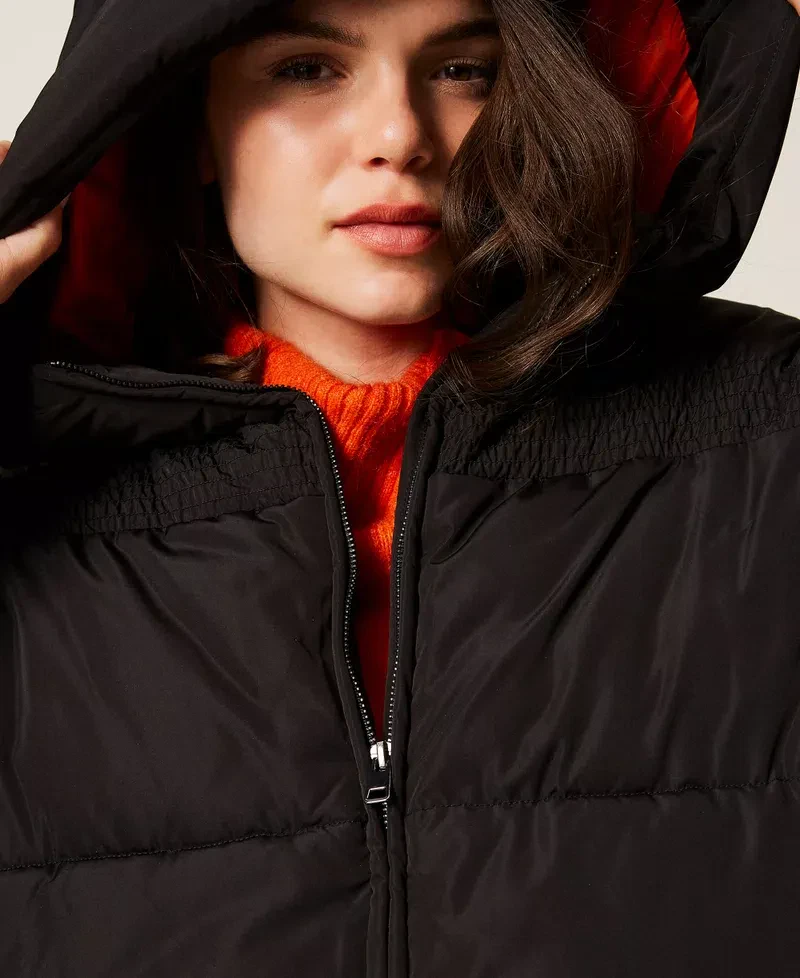 Actitude collection puffer jacket made from matte technical material, with wadding, ruffled stitching on yoke and sleeves. Hood, zip fastening, inset pockets at the sides, contrast lining, straight fit.