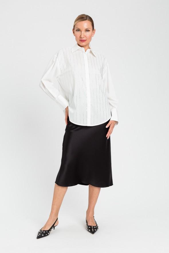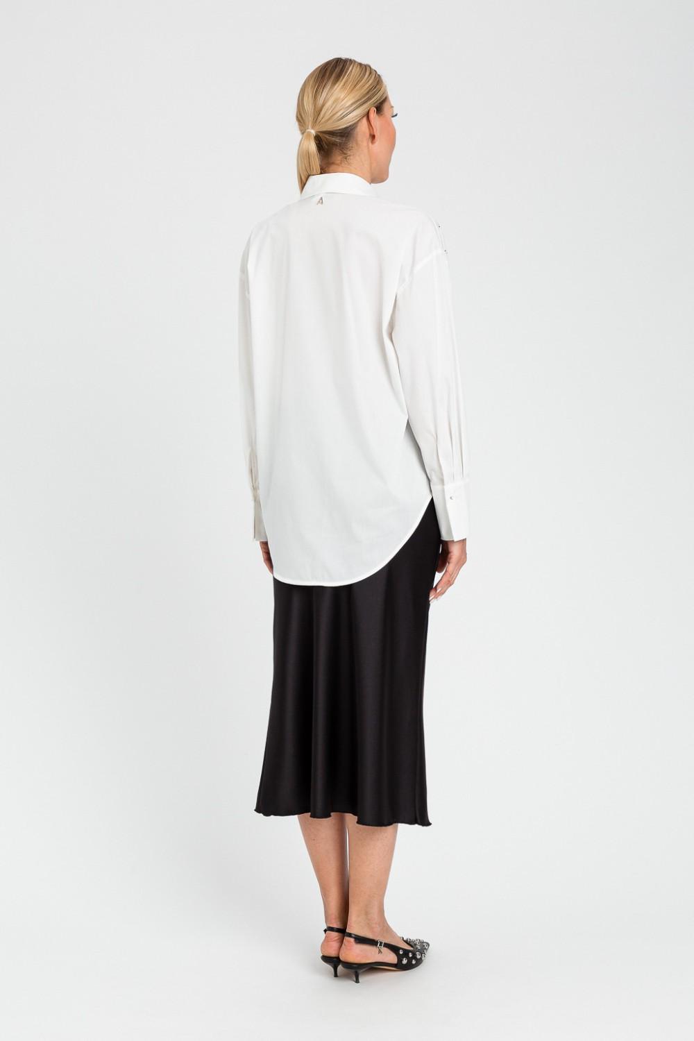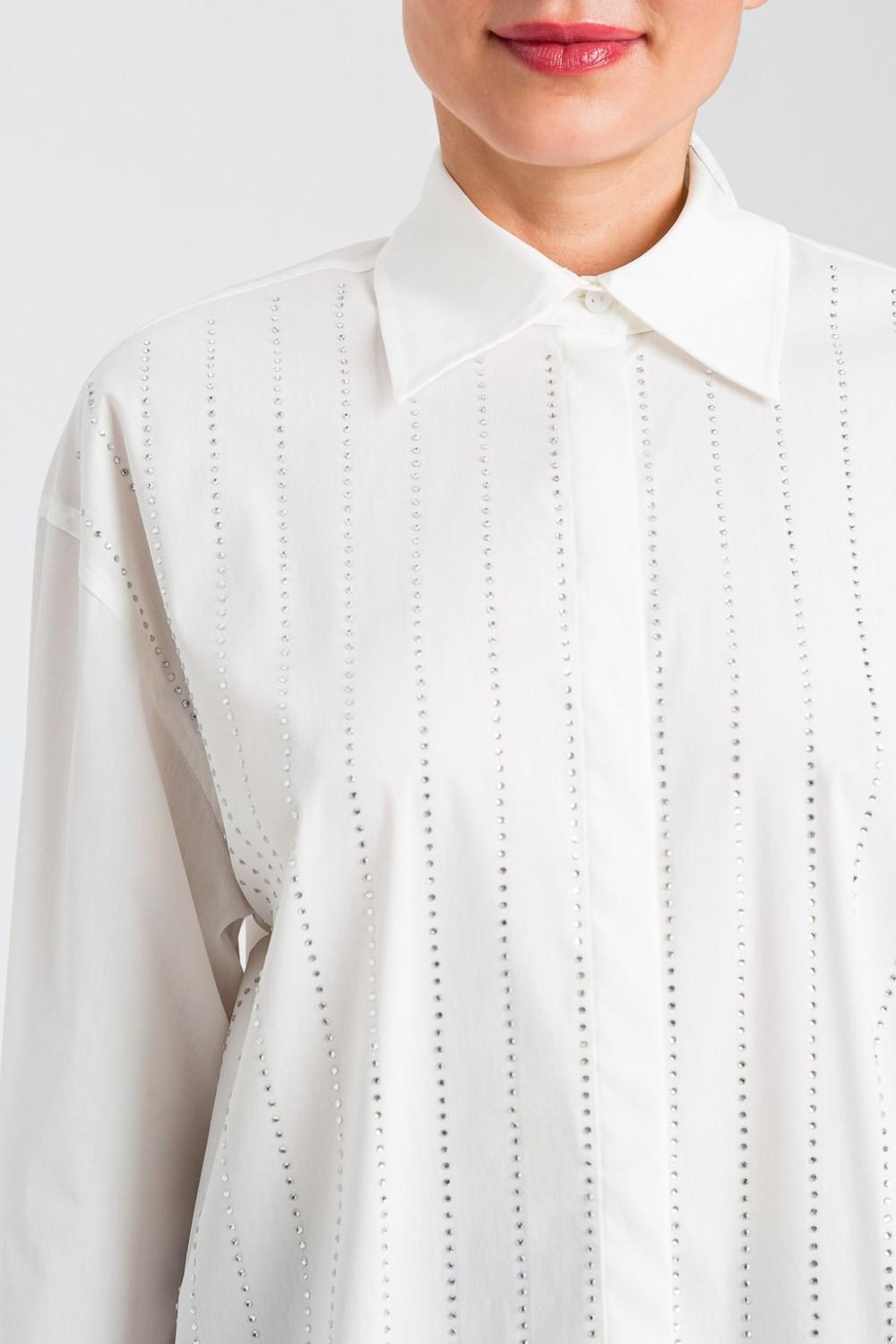 TWINSET shirt featuring a single-breasted fastening with hidden buttons, with decorative stones arranged vertically on the front, long sleeves, with a button on the back of the cuffs, loose fit.
