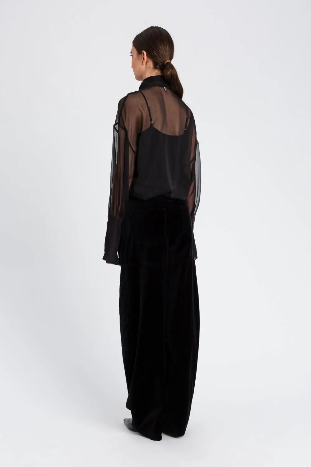 Actitude collection voile shirt with high neck and sash that ties in a bow. Button fastening on the front, long sleeves with slouched shoulders, wide cuffs fastened with buttons, matching undershirt top, straight fit.