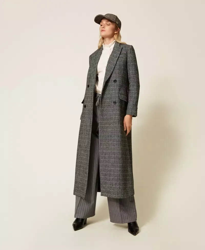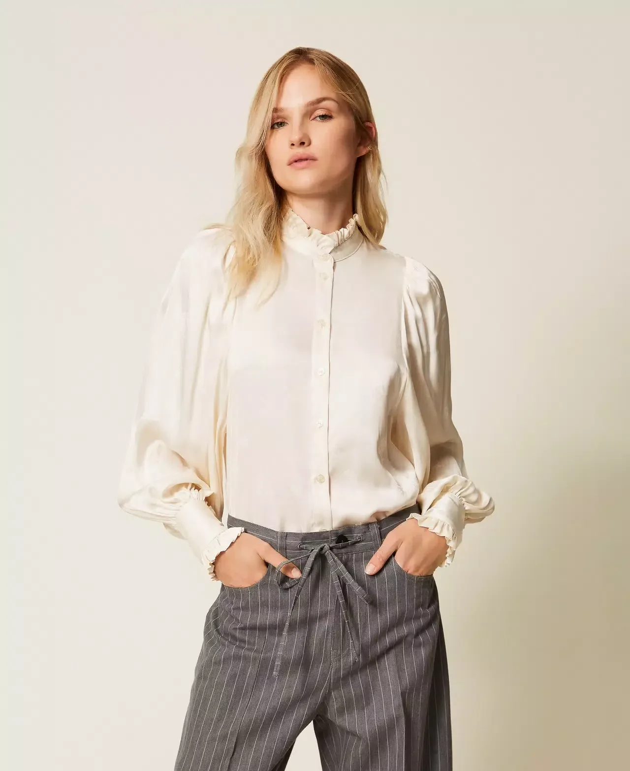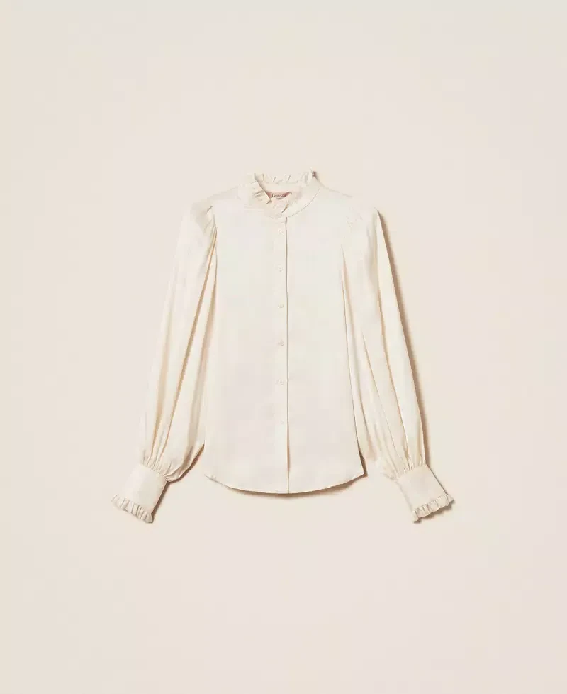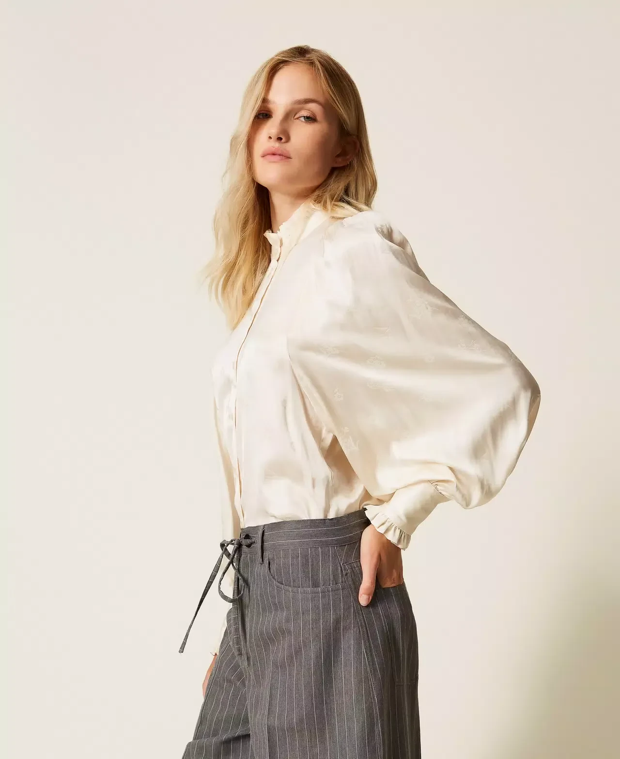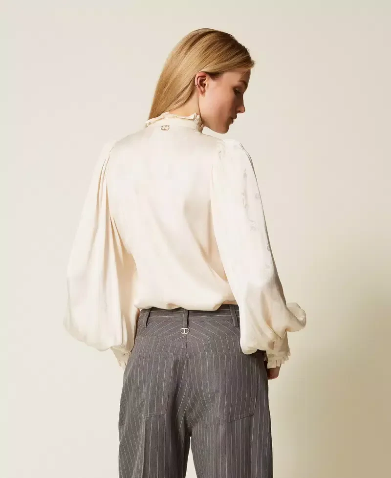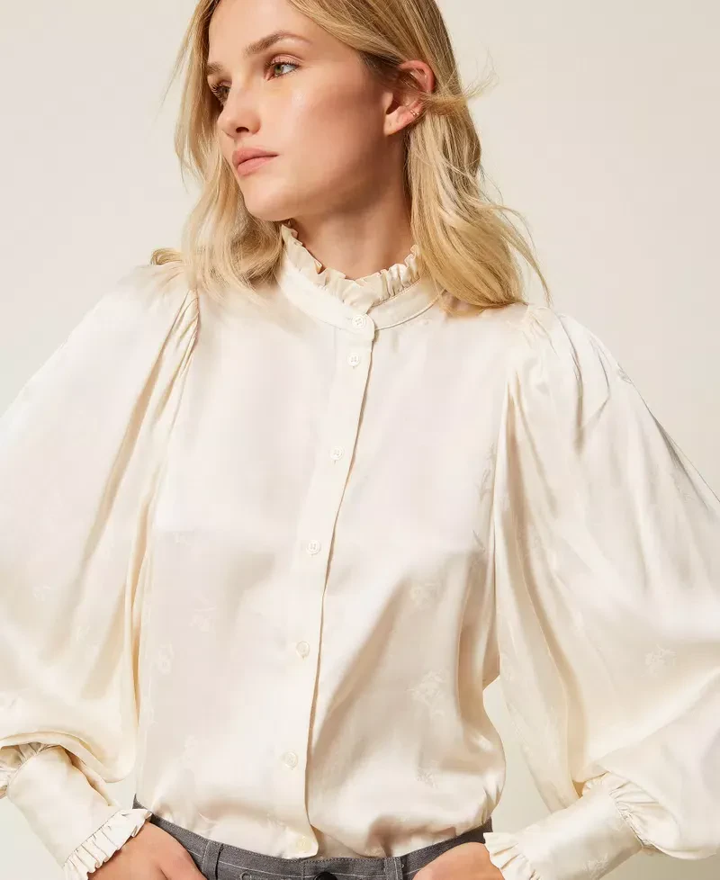 Viscose satin jacquard shirt with floral design. High neck with ruffles, matching colour button fastening, long sleeves with gathered shoulders and wide cuffs with ruffles, Oval T logo plate on the back, loose fit.