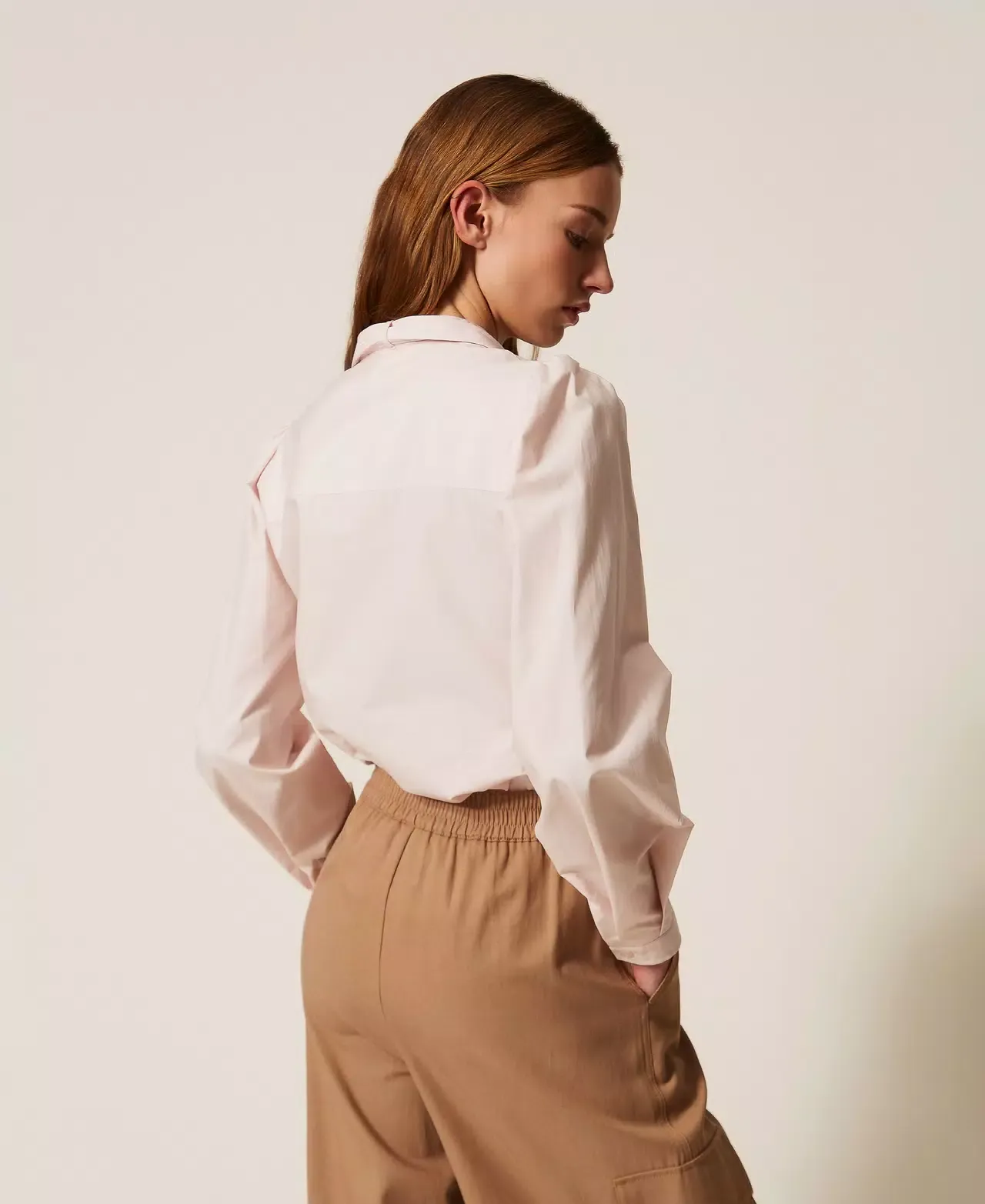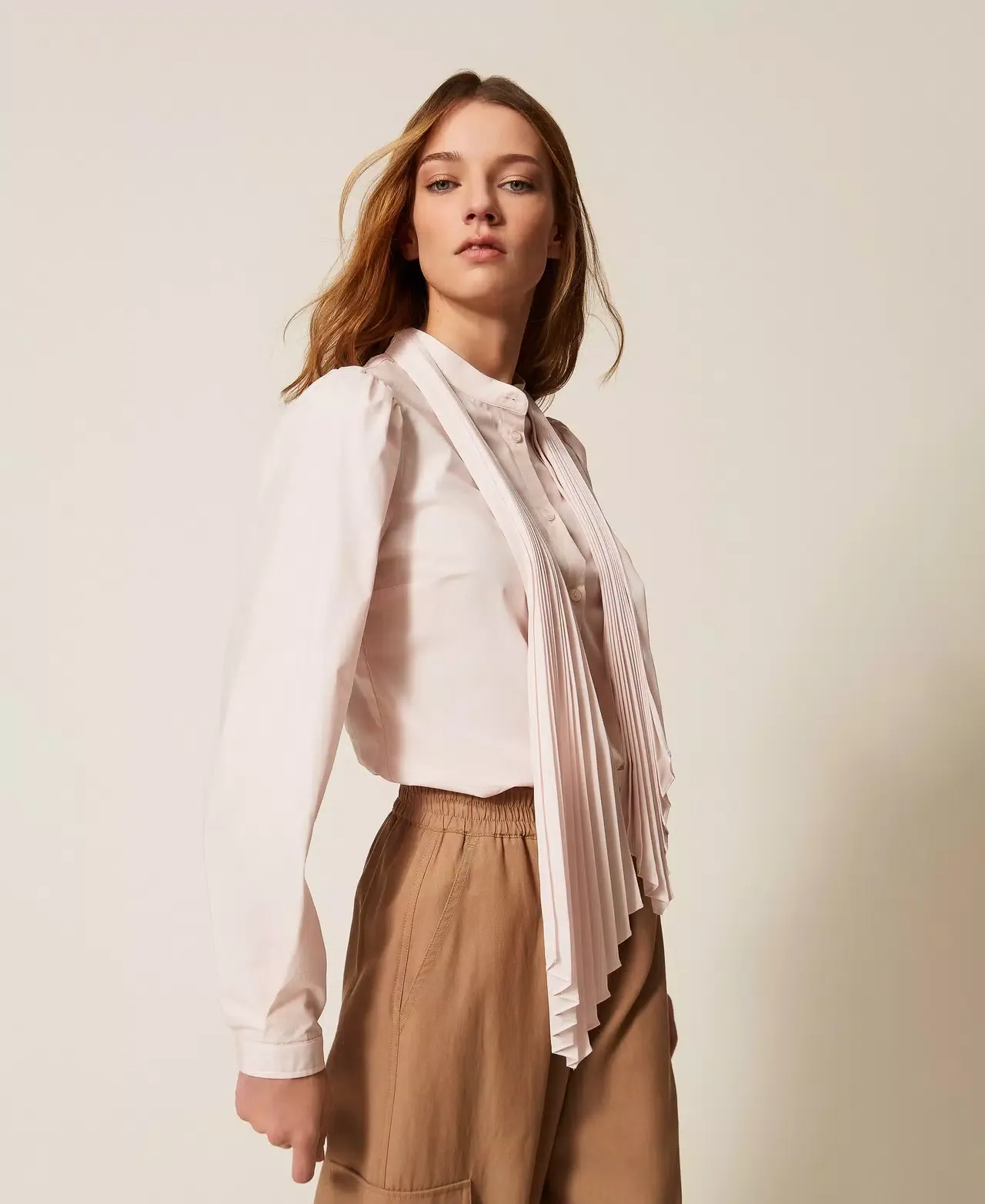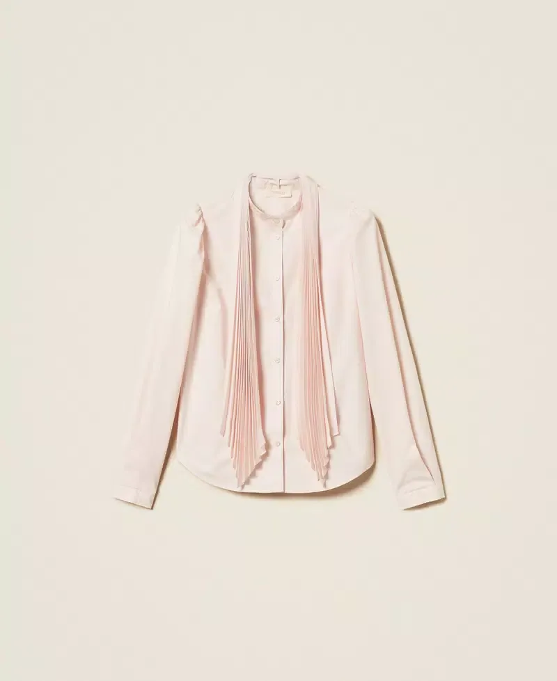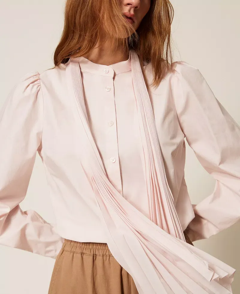 Cotton poplin shirt (20% certified pre-consumer recycled cotton) with pleated crêpe de Chine (100% certified post-consumer recycled polyester) sash inserted in a loop on the back. Stand-up collar, long sleeves with cuff and button, button fastening, straight fit. Any micro-impurities are typical of recycled materials. This item is part of the “Archive” range, inspired by the most iconic and most loved garments from the Twinset collections.