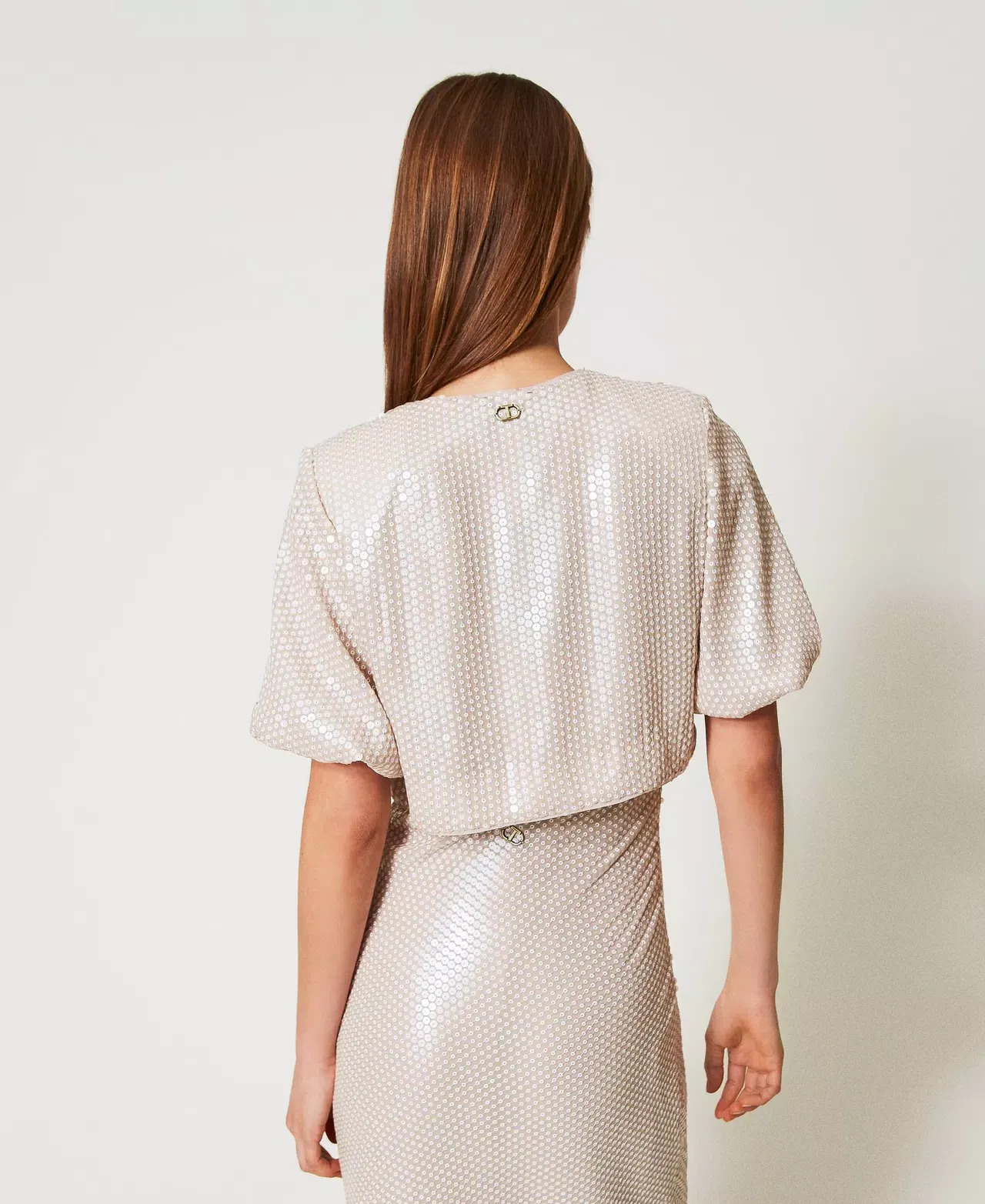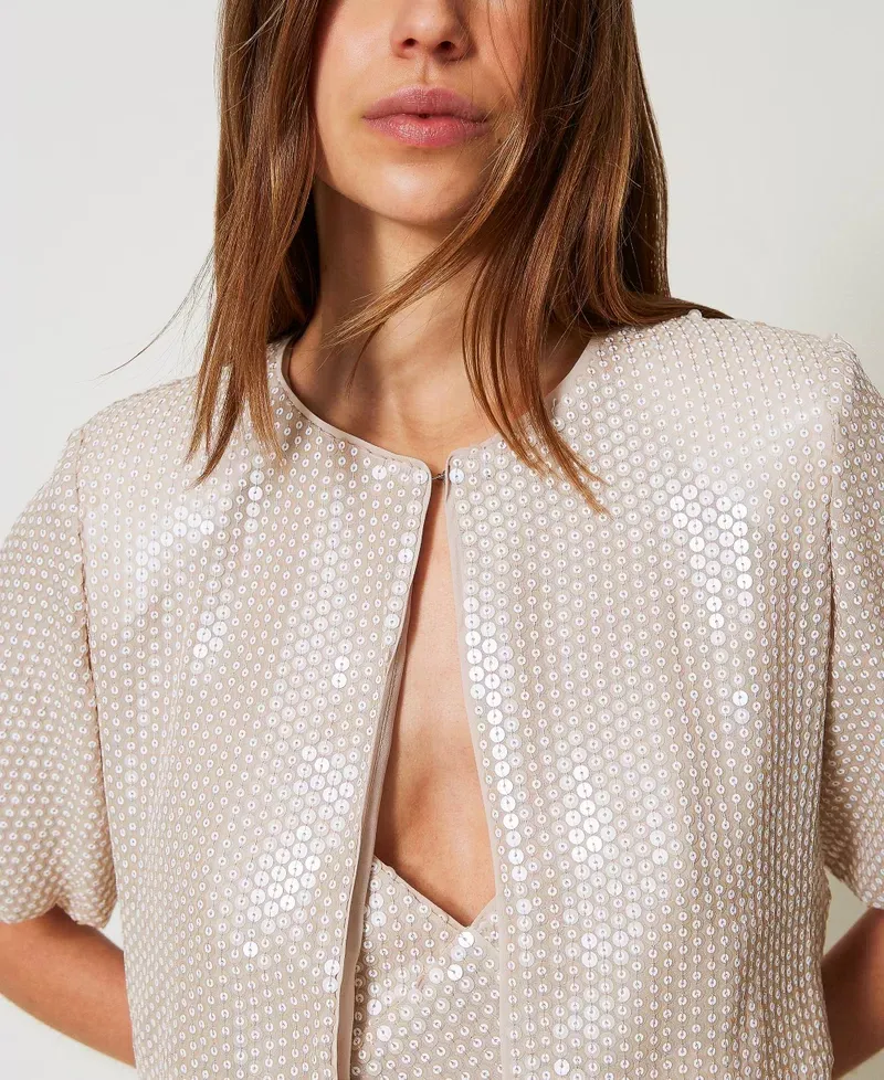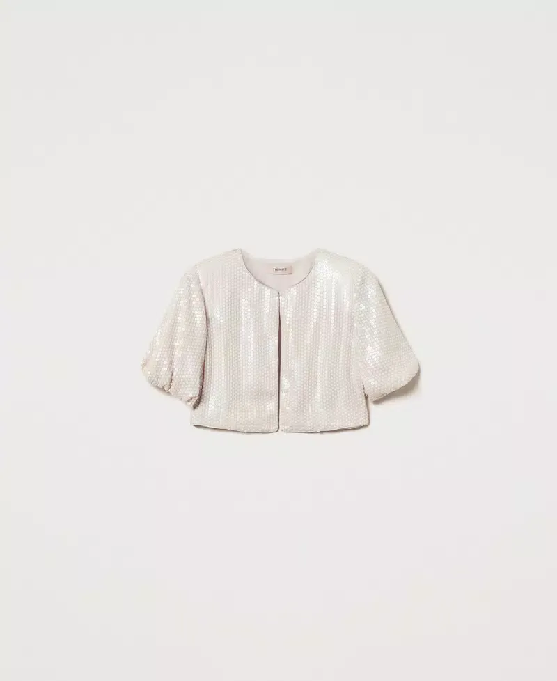 Shrug in fabric embroidered with sequins with edge-to-edge fastening at the neck, short sleeves with puffball hem, lining and a straight fit. Perfect for parties and formal occasions.