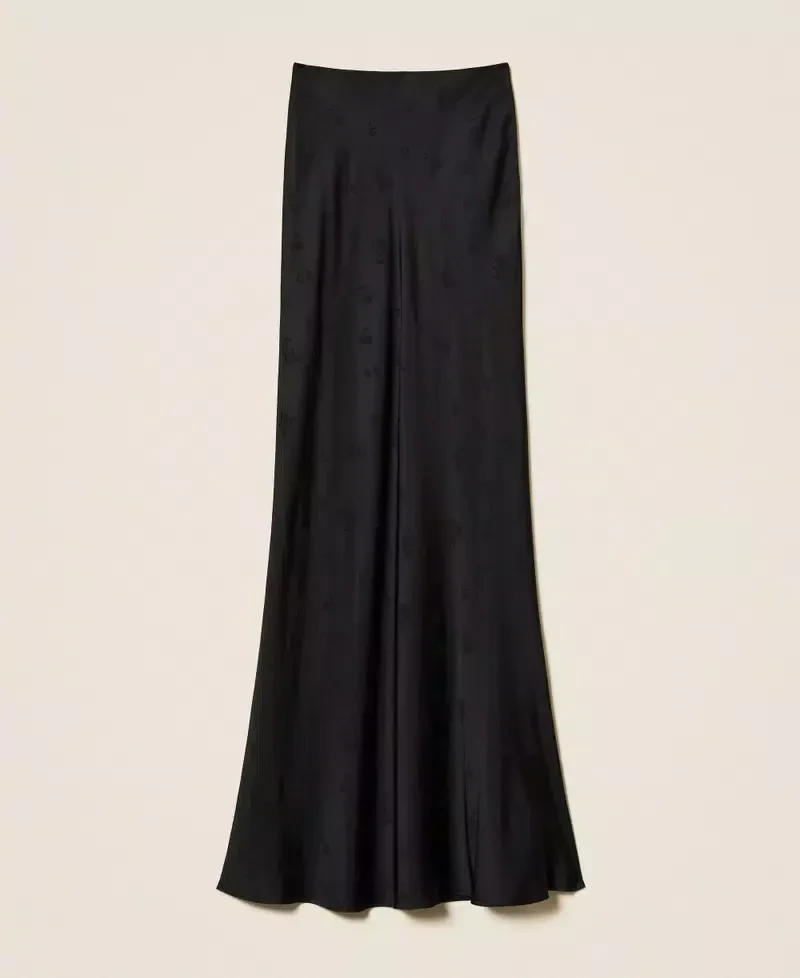 Long bias cut jacquard viscose satin skirt with floral design. Side zip fastening, Oval T logo plate on the back, loose fit.