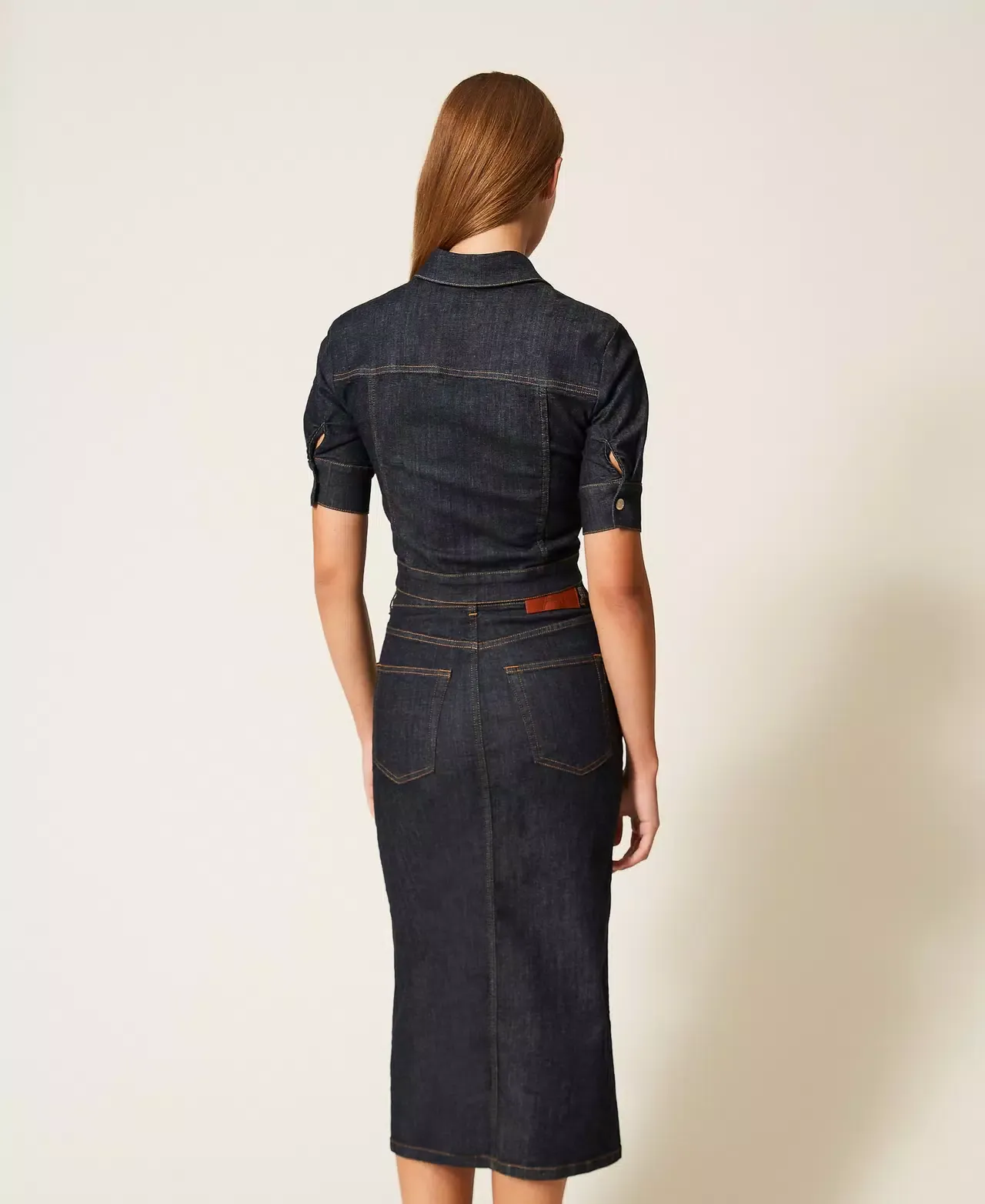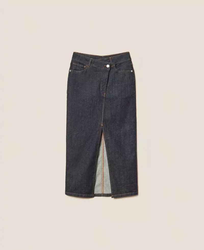Actitude collection midi skirt made from stretch cotton denim with asymmetric fastening at the waist. Belt loops, five pockets, front slit, tobacco-coloured stitching, straight fit.