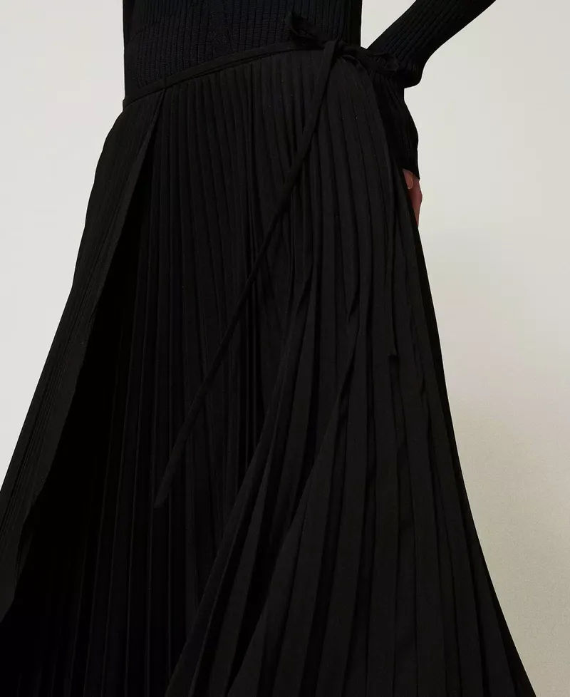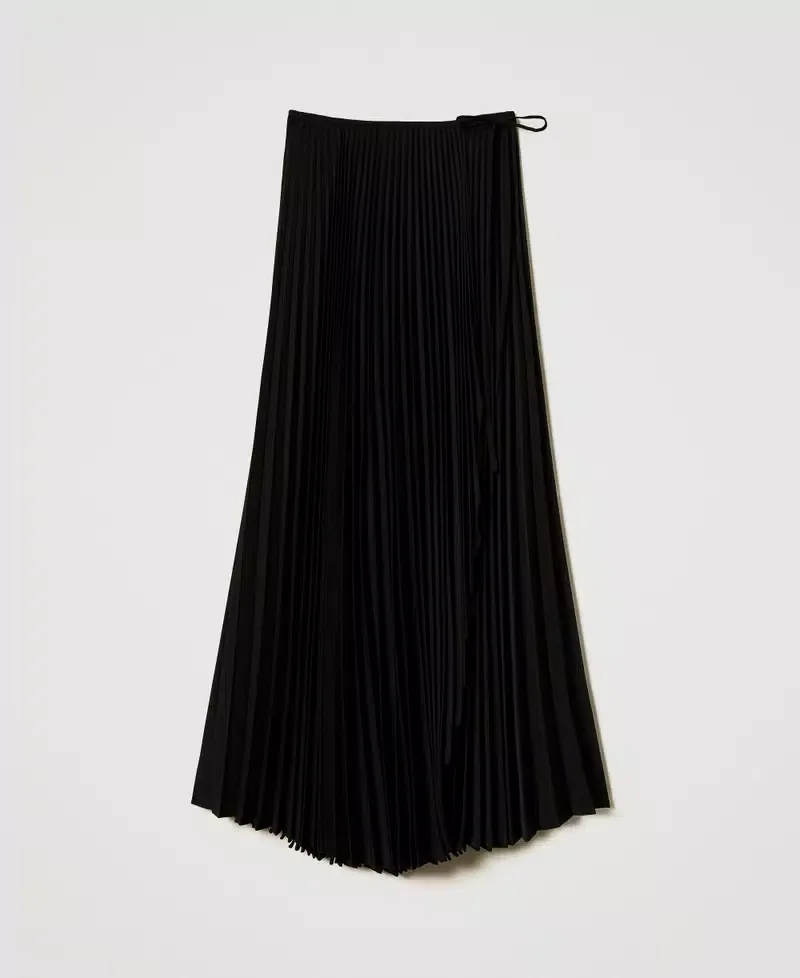 Long wrap-around skirt with sunray pleats and circular construction. Tied around the waist with adjustable ribbons, Oval T logo plate at the back, lining, loose fit.