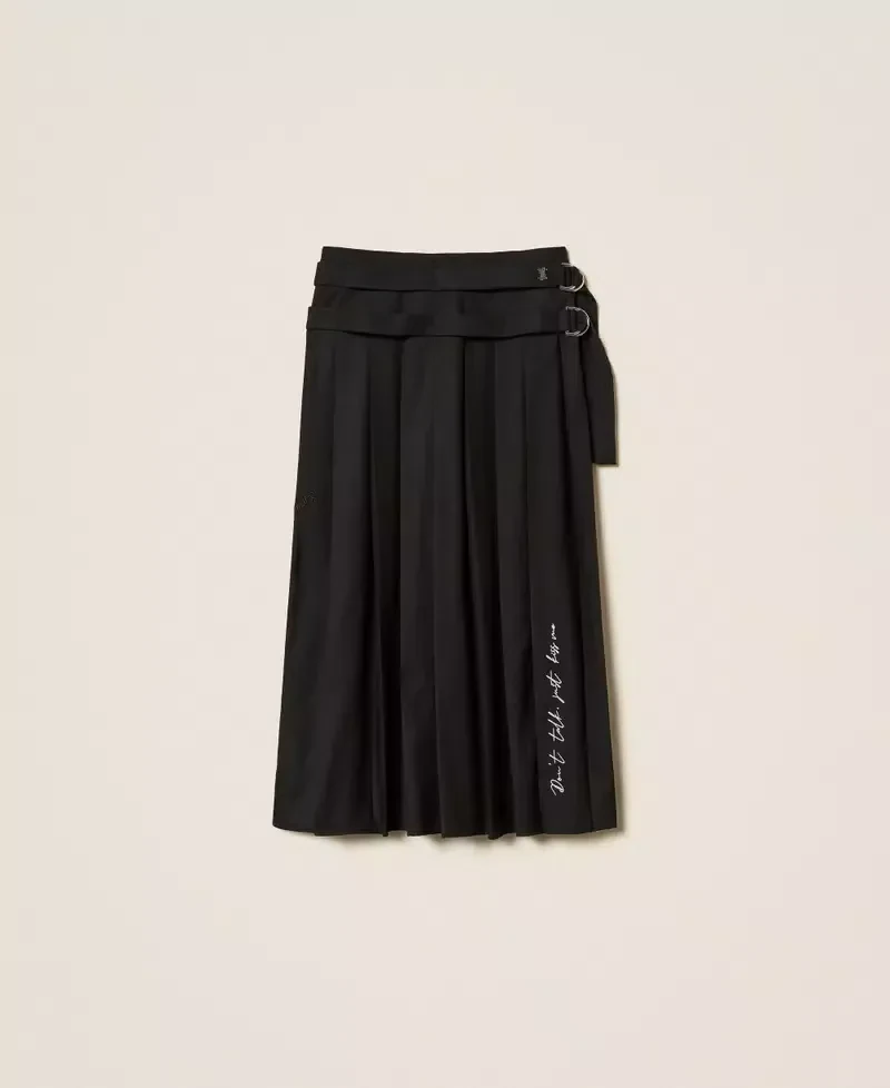 Long skirt designed by artist Myfo for the Actitude collection, made from kilt-effect viscose blend fabric with pleats and contrasting embroidery. Side zip fastening, double belt with metal buckles, large front slit. Flared.