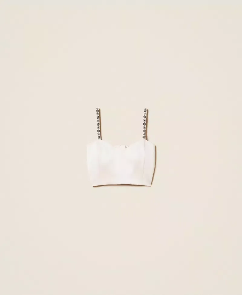 Duchesse cropped top with thin shoulder straps embroidered with bezels. Back zip fastening, lining, fitted. Perfect for parties and formal occasions.