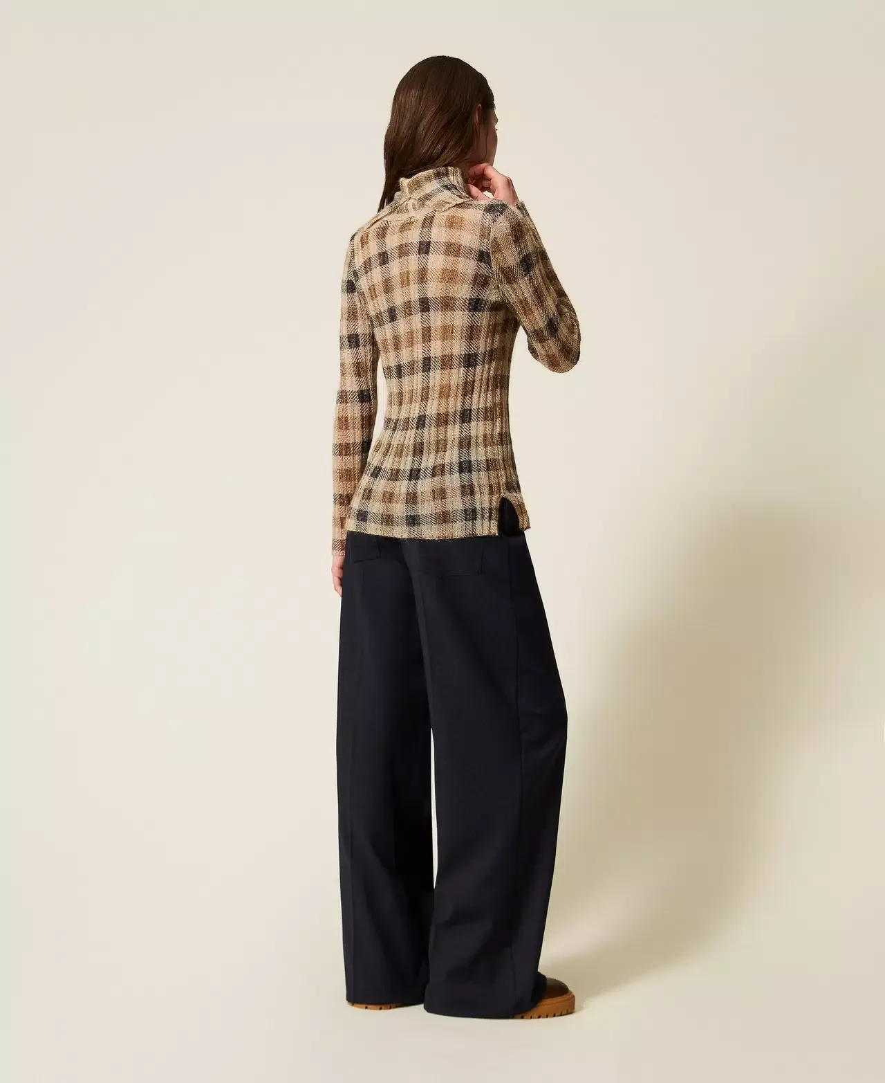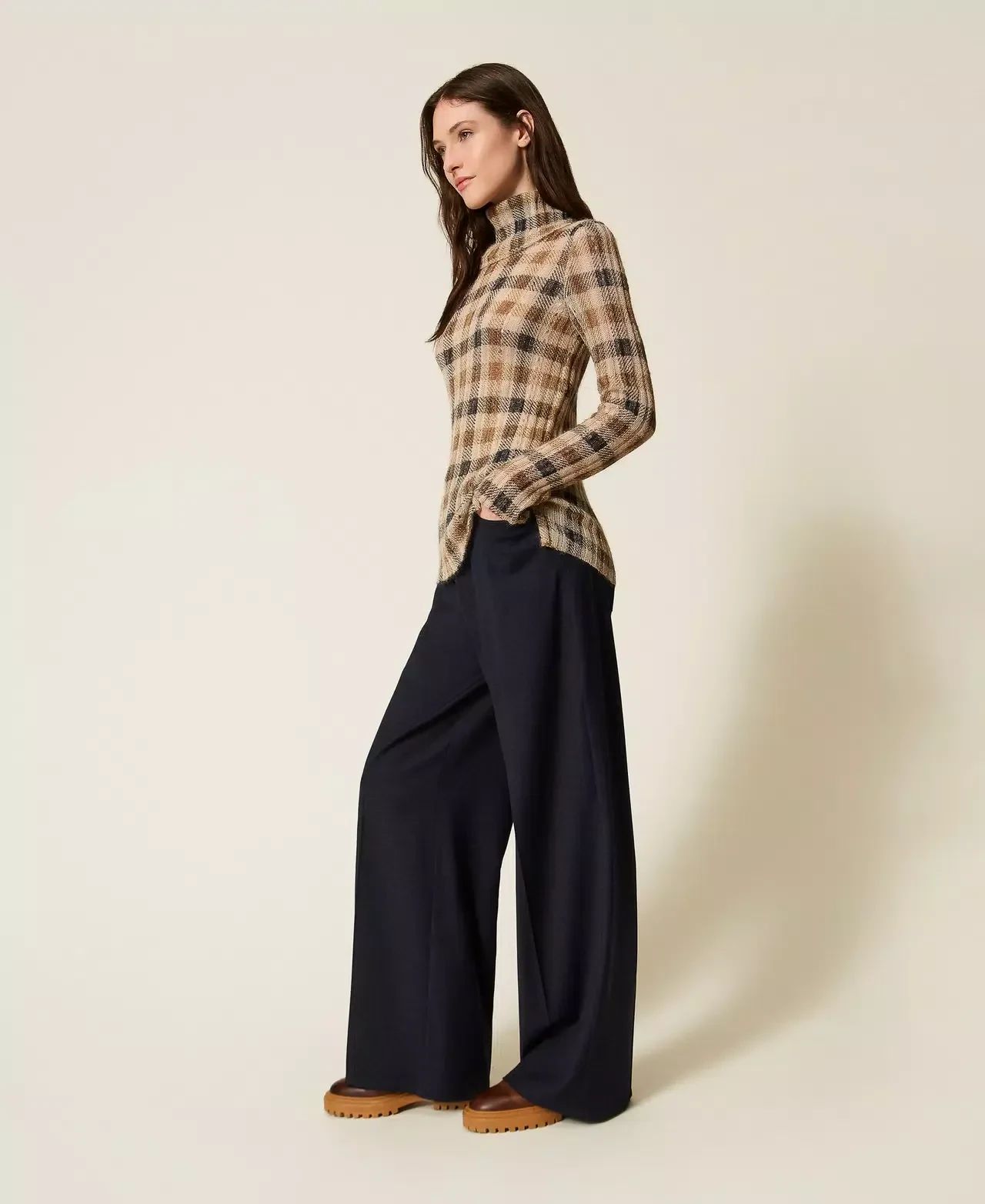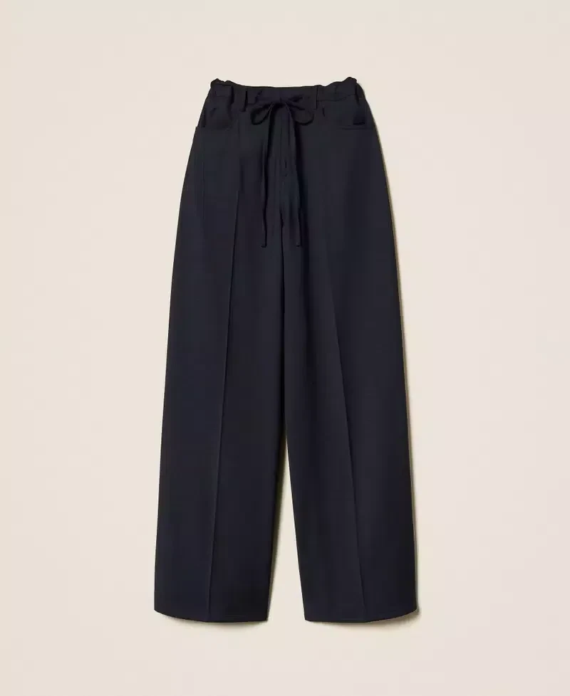 Wool and viscose blend twill trousers with five pockets and double stitching. Drawstring at the waist, zip and button fastening, ironed crease, Oval T logo plate at the back, wide fit.