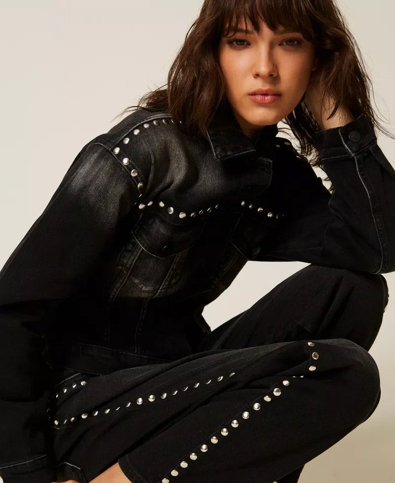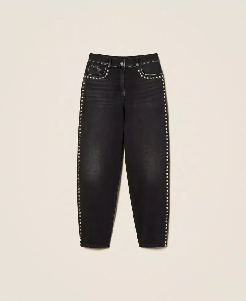 Actitude collection stretch cotton jeans with hotfix studs along the pockets and sides. Lightening on the front, zip and button fastening, five pockets, barrel fit.