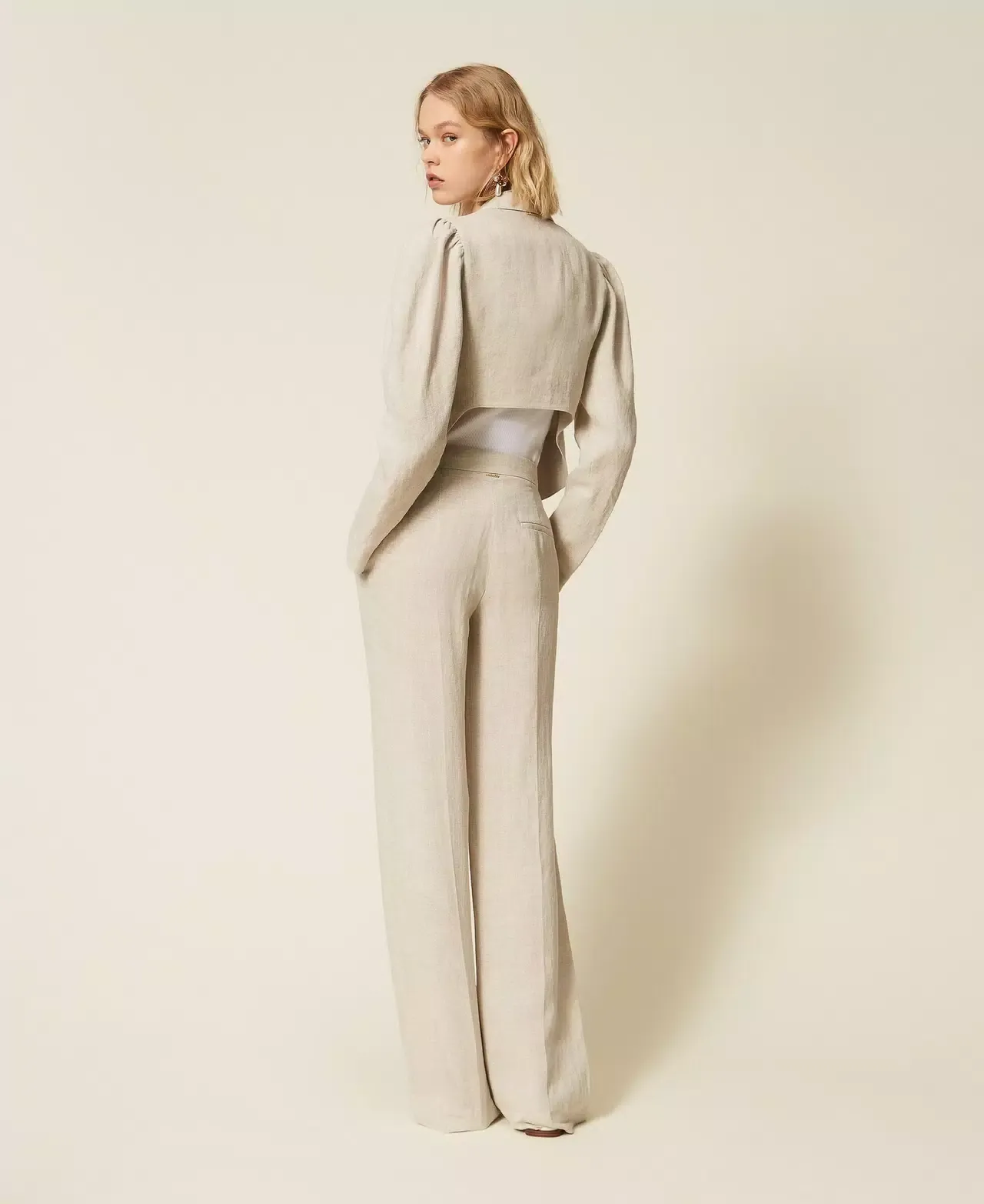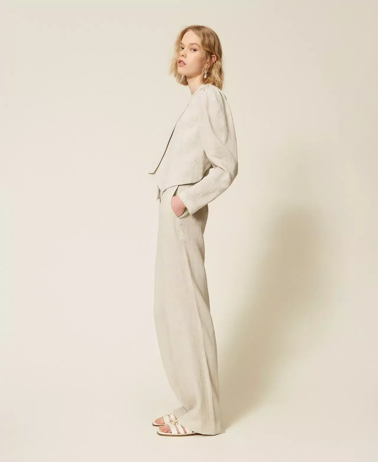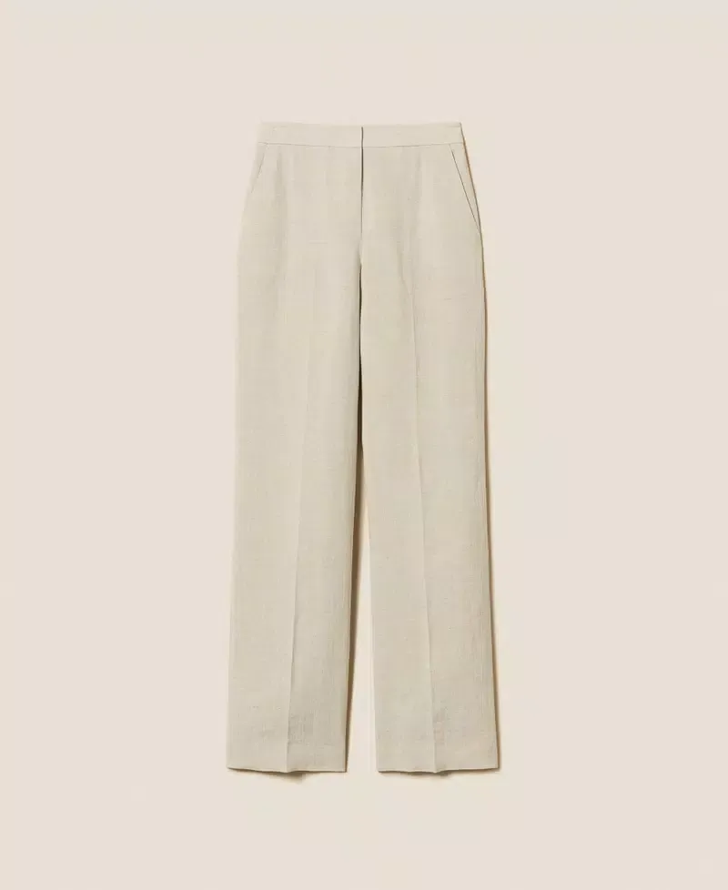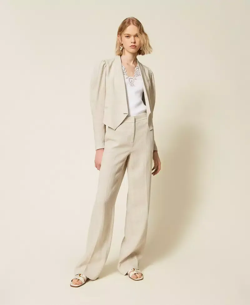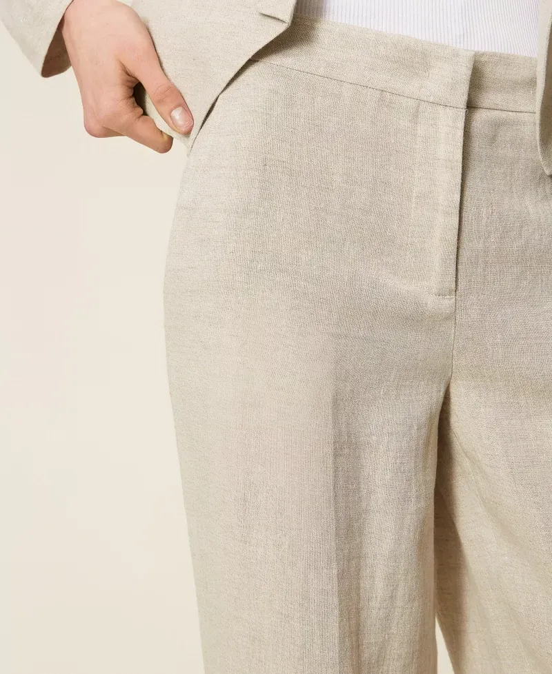 Trousers made in Italy from natural linen with lurex that creates a soft light effect. Mannish zip and hook fastening, slant pockets on the sides and welt pockets on the back, ironed crease, wide fit.