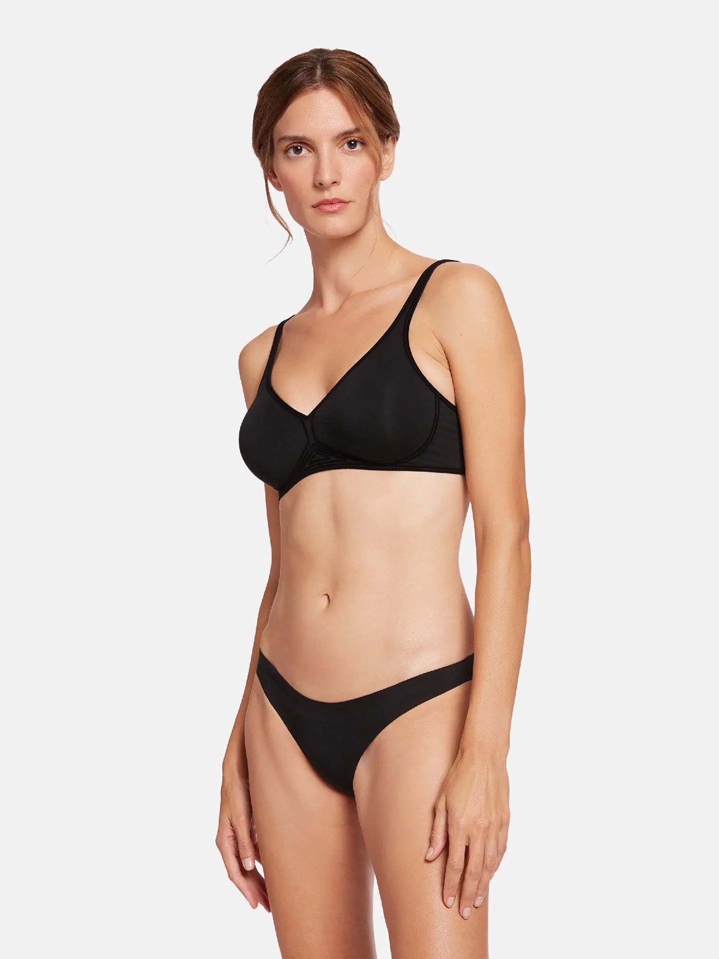 Wireless, adjustable straps The completely new technique features a velvety, reinforced selvedge making this bra ultra-soft with comfortable support and a modern plunge neckline. Flocked silicone strips assume the function of underwiring and stretchy elastic. The two-ply cotton contour material feels particularly natural against the skin. Adjustable straps / Molded cups / Flocked silicone lines replace the underwire and elastics / Two-ply material